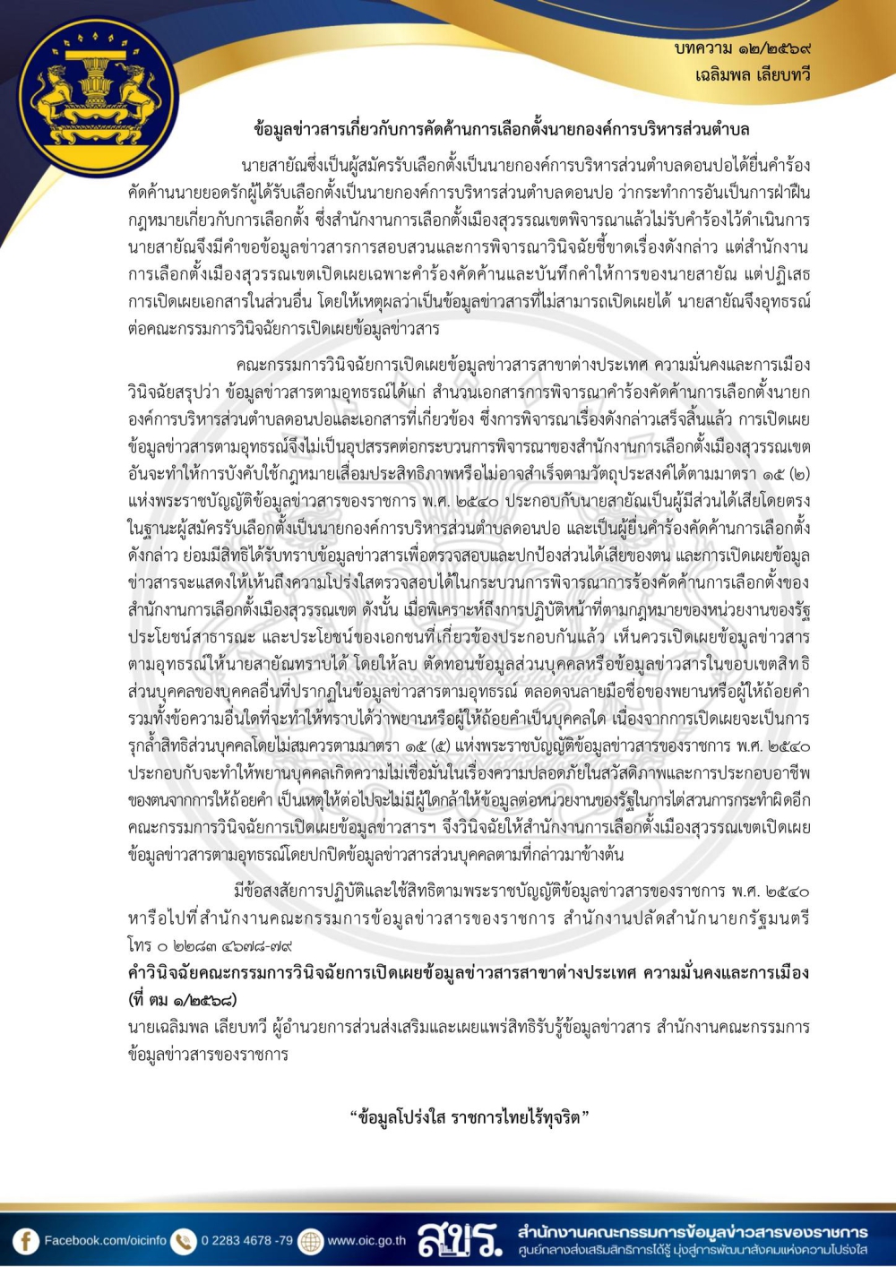 ข้อมูลข่าวสารเกี่ยวกับการคัดค้านการเลือกตั้งนายกองค์การบริหารส่วนตำบล