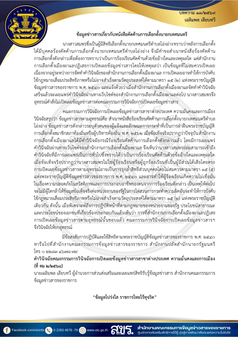 ข้อมูลข่าวสารเกี่ยวกับหนังสือคัดค้านการเลือกตั้งนายกเทศมนตรี