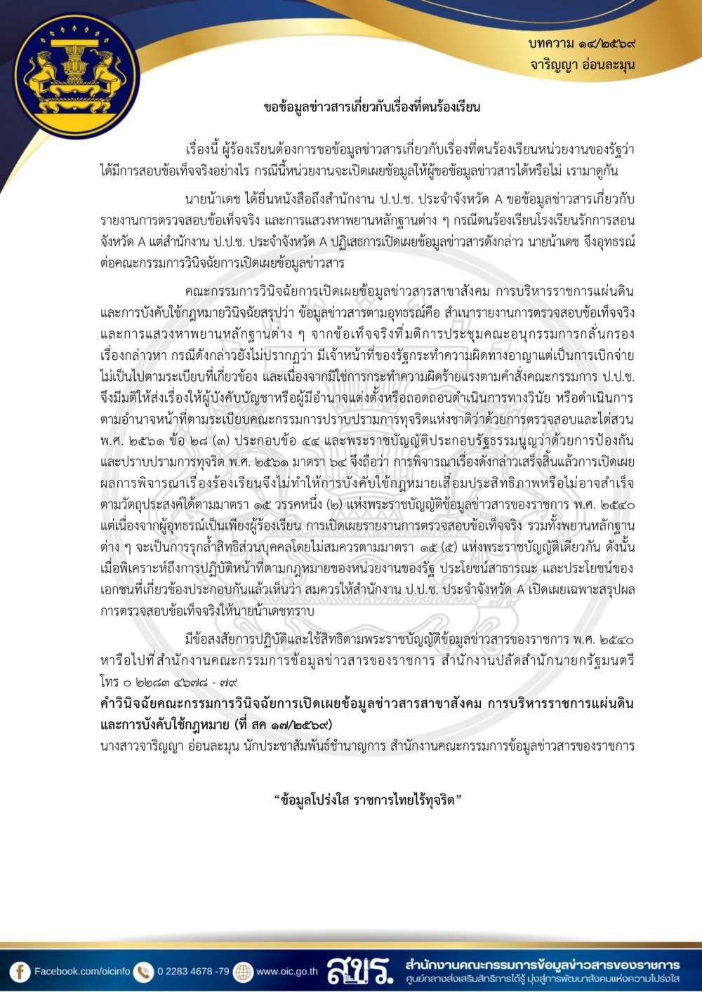 ขอข้อมูลข่าวสารเกี่ยวกับเรื่องที่คนร้องเรียน