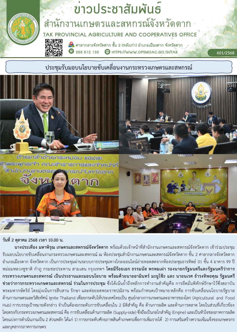 นางประเทือง มหาพิรุณ เกษตรและสหกรณ์จังหวัดตาก พร้อมด้วยเจ้าหน้าที่สำนักงานเกษตรและสหกรณ์จังหวัดตาก เข้าร่วมประชุมรับมอบนโยบายขับเคลื่อนงานกระทรวงเกษตรและสหกรณ์ ณ ห้องประชุมสำนักงานเกษตรและสหกรณ์จังหวัดตาก ชั้น 2 ศาลากลางจังหวัดตาก อำเภอเมืองตาก จังหวัดตาก เป็นการประชุมผ่านระบบการประชุมทางไกลออนไลน์ถ่ายทอดสดจากห้องประชุมธารทิพย์ 01 ชั้น 4 อาคาร 99 ปี หม่อมหลวงชูชาติ กำภู กรมชลประทาน สามเสน กรุงเทพฯ โดยมีร้อยเอก ธรรมนัส พรหมเผ่า รองนายกรัฐมนตรีและรัฐมนตรีว่าการกระทรวงเกษตรและสหกรณ์ เป็นประธานและมอบนโยบาย พร้อมด้วยนายอามินทร์ มะยูโซ๊ะ และ นายนเรศ ธำรงทิพยคุณ รัฐมนตรีช่วยว่าการกระทรวงเกษตรและสหกรณ์ ร่วมในการประชุม ซึ่งได้เน้นย้ำถึงหลักการทำงานสำคัญคือ การยึดมั่นพิทักษ์รักษาไว้ซึ่งสถาบันพระมหากษัตริย์ โดยมุ่งเน้นการสืบสาน รักษา และต่อยอดพระราชปณิธาน พร้อมกำหนดเป้าหมายหลักคือ การขับเคลื่อนนโยบายรัฐบาล ด้านการเกษตรและวิสัยทัศน์ Ignite Thailand เพื่อยกระดับให้ประเทศไทยเป็น ศูนย์กลางการเกษตรและอาหารของโลก (Agricultural and Food Hub) การบรรลุเป้าหมายดังกล่าว จำเป็นต้องยกระดับการขับเคลื่อนใน 2 มิติสำคัญ คือ ด้านการผลิต และด้านการตลาด โดยในส่วนที่เกี่ยวข้องโดยตรงกับกระทรวงเกษตรและสหกรณ์ คือ การขับเคลื่อนด้านการผลิต (Supply-side) ซึ่งถือเป็นกลไกสำคัญ (Engine) และเป็นหัวใจของภาคการผลิต โดยแบ่งการดำเนินงานเป็น 2 ส่วนหลัก ได้แก่ 1) การยกระดับศักยภาพสินค้าเกษตรเพื่อการเพิ่มรายได้ 2) การเสริมสร้างความเข้มแข็งของเกษตรกรและบุคลากรภาคการเกษตร