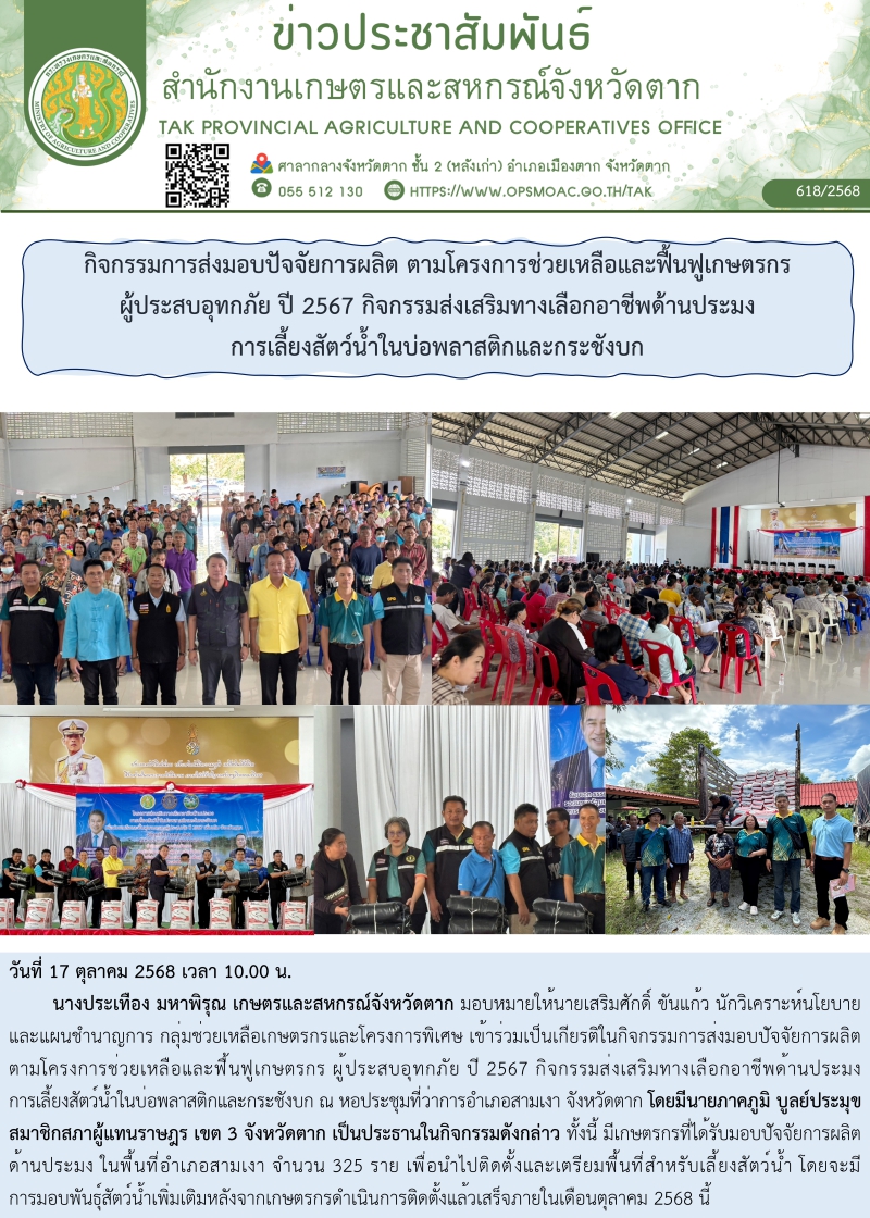 นางประเทือง มหาพิรุณ เกษตรและสหกรณ์จังหวัดตาก มอบหมายให้นายเสริมศักดิ์ ขันแก้ว นักวิเคราะห์นโยบายและแผนชำนาญการ กลุ่มช่วยเหลือเกษตรกรและโครงการพิเศษ เข้าร่วมเป็นเกียรติในกิจกรรมการส่งมอบปัจจัยการผลิต ตามโครงการช่วยเหลือและฟื้นฟูเกษตรกร ผู้ประสบอุทกภัย ปี 2567 กิจกรรมส่งเสริมทางเลือกอาชีพด้านประมง การเลี้ยงสัตว์น้ำในบ่อพลาสติกและกระชังบก ณ หอประชุมที่ว่าการอำเภอสามเงา จังหวัดตาก โดยมีนายภาคภูมิ บูลย์ประมุข สมาชิกสภาผู้แทนราษฎร เขต 3 จังหวัดตาก เป็นประธานในกิจกรรมดังกล่าว ทั้งนี้ มีเกษตรกรที่ได้รับมอบปัจจัยการผลิตด้านประมง ในพื้นที่อำเภอสามเงา จำนวน 325 ราย เพื่อนำไปติดตั้งและเตรียมพื้นที่สำหรับเลี้ยงสัตว์น้ำ โดยจะมีการมอบพันธุ์สัตว์น้ำเพิ่มเติมหลังจากเกษตรกรดำเนินการติดตั้งแล้วเสร็จภายในเดือนตุลาคม 2568 นี้
