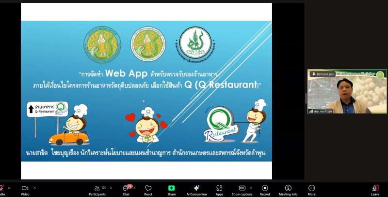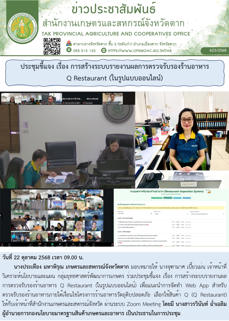 นางประเทือง มหาพิรุณ เกษตรและสหกรณ์จังหวัดตาก มอบหมายให้ นางจุฑามาศ เปี้ยวเม่น เจ้าหน้าที่วิเคราะห์นโยบายและแผน กลุ่มยุทธศาสตร์พัฒนาการเกษตร ร่วมประชุมชี้แจง เรื่อง การสร้างระบบรายงานผลการตรวจรับรองร้านอาหาร Q Restaurant (ในรูปแบบออนไลน์) เพื่อแนะนำการจัดทำ Web App สำหรับตรวจรับรองร้านอาหารภายใต้เงื่อนไขโครงการร้านอาหารวัตถุดิบปลอดภัย เลือกใช้สินค้า Q (Q Restaurant) ให้กับเจ้าหน้าที่สำนักงานเกษตรและสหกรณ์จังหวัด ผ่านระบบ Zoom Meeting โดยมี นางสาวรวินันท์ ฉ่ำเฉลิม ผู้อำนวยการกองนโยบายมาตรฐานสินค้าเกษตรและอาหาร เป็นประธานในการประชุม