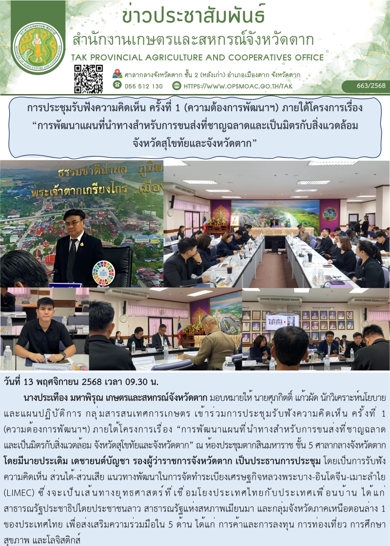 นางประเทือง มหาพิรุณ เกษตรและสหกรณ์จังหวัดตาก มอบหมายให้ นายศุภกิตติ์ แก้วผัด นักวิเคราะห์นโยบายและแผนปฏิบัติการ กลุ่มสารสนเทศการเกษตร เข้าร่วมการประชุมรับฟังความคิดเห็น ครั้งที่ 1 (ความต้องการพัฒนาฯ) ภายใต้โครงการเรื่อง “การพัฒนาแผนที่นำทางสำหรับการขนส่งที่ชาญฉลาดและเป็นมิตรกับสิ่งแวดล้อม จังหวัดสุโขทัยและจังหวัดตาก” ณ ห้องประชุมตากสินมหาราช ชั้น 5 ศาลากลางจังหวัดตาก โดยมีนายประเดิม เดชายนต์บัญชา รองผู้ว่าราชการจังหวัดตาก เป็นประธานการประชุม โดยเป็นการรับฟังความคิดเห็น ส่วนได้-ส่วนเสีย แนวทางพัฒนาในการจัดทำระเบียงเศรษฐกิจหลวงพระบาง-อินโดจีน-เมาะลำไย (LIMEC) ซึ่งจะเป็นเส้นทางยุทธศาสตร์ที่เชื่อมโยงประเทศไทยกับประเทศเพื่อนบ้าน ได้แก่ สาธารณรัฐประชาธิปไตยประชาชนลาว สาธารณรัฐแห่งสหภาพเมียนมา และกลุ่มจังหวัดภาคเหนือตอนล่าง 1 ของประเทศไทย เพื่อส่งเสริมความร่วมมือใน 5 ด้าน ได้แก่ การค้าและการลงทุน การท่องเที่ยว การศึกษา สุขภาพ และโลจิสติกส์