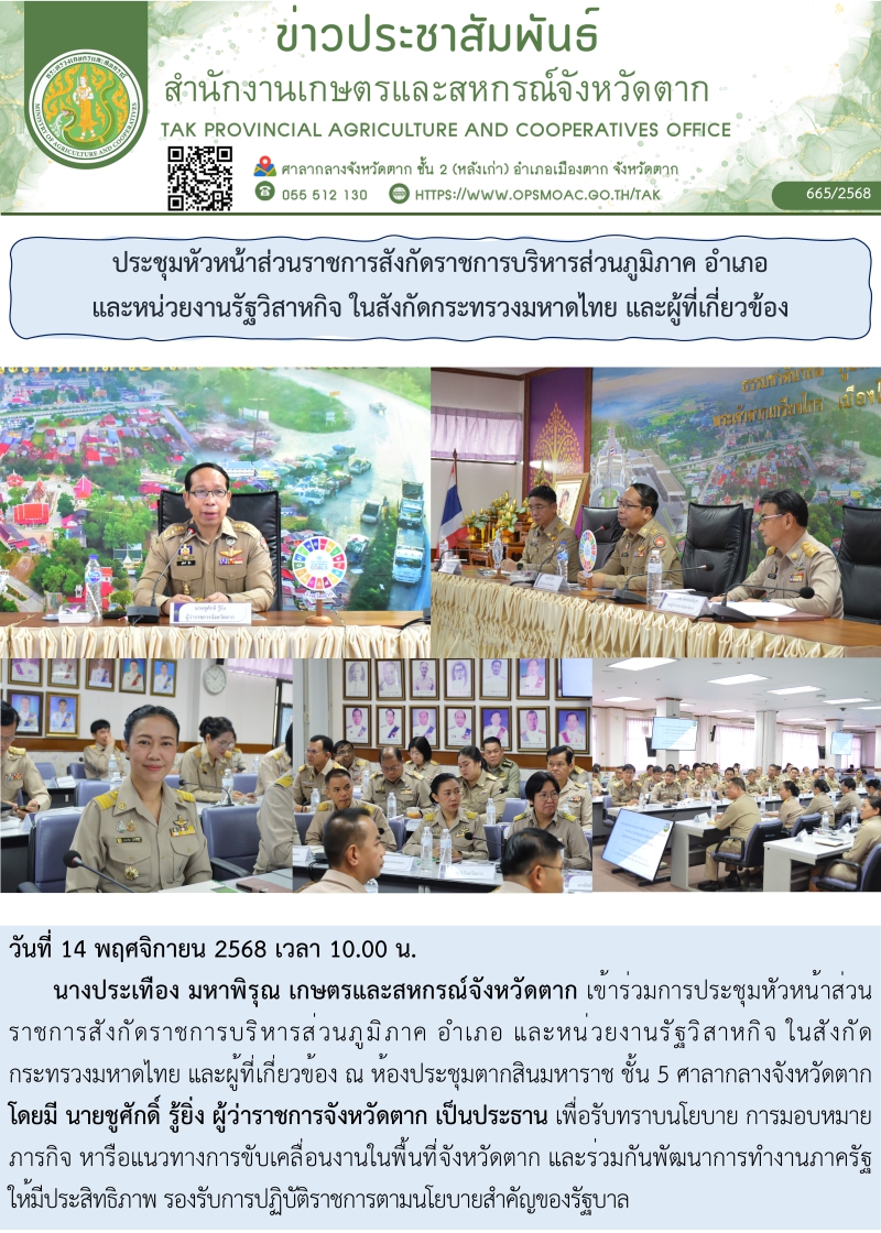 นางประเทือง มหาพิรุณ เกษตรและสหกรณ์จังหวัดตาก เข้าร่วมการประชุมหัวหน้าส่วนราชการสังกัดราชการบริหารส่วนภูมิภาค อำเภอ และหน่วยงานรัฐวิสาหกิจ ในสังกัดกระทรวงมหาดไทย และผู้ที่เกี่ยวข้อง ณ ห้องประชุมตากสินมหาราช ชั้น 5 ศาลากลางจังหวัดตาก โดยมี นายชูศักดิ์ รู้ยิ่ง ผู้ว่าราชการจังหวัดตาก เป็นประธาน เพื่อรับทราบนโยบาย การมอบหมายภารกิจ หารือแนวทางการขับเคลื่อนงานในพื้นที่จังหวัดตาก และร่วมกันพัฒนาการทำงานภาครัฐให้มีประสิทธิภาพ รองรับการปฏิบัติราชการตามนโยบายสำคัญของรัฐบาล