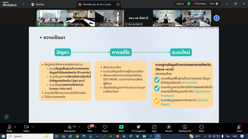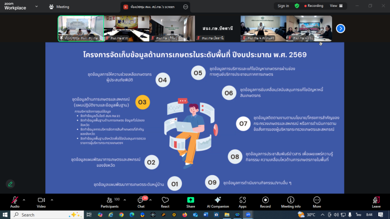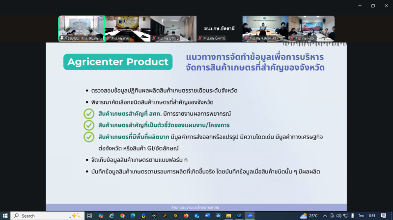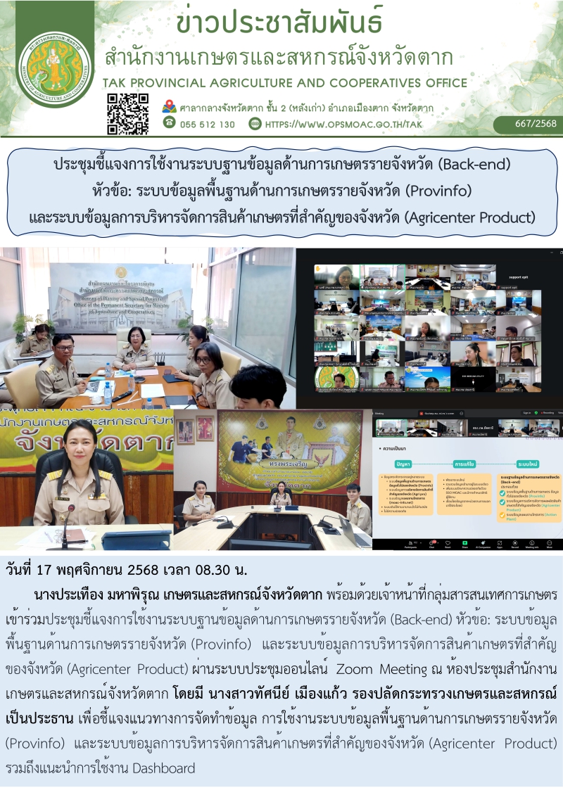 เข้าร่วมประชุมชี้แจงการใช้งานระบบฐานข้อมูลด้านการเกษตรรายจังหวัด (Back-end) หัวข้อ: ระบบข้อมูลพื้นฐานด้านการเกษตรรายจังหวัด (Provinfo) และระบบข้อมูลการบริหารจัดการสินค้าเกษตรที่สำคัญของจังหวัด (Agricenter Product) ผ่านระบบประชุมออนไลน์ Zoom Meeting ณ ห้องประชุมสำนักงานเกษตรและสหกรณ์จังหวัดตาก โดยมี นางสาวทัศนีย์ เมืองแก้ว รองปลัดกระทรวงเกษตรและสหกรณ์ เป็นประธาน เพื่อชี้แจงแนวทางการจัดทำข้อมูล การใช้งานระบบข้อมูลพื้นฐานด้านการเกษตรรายจังหวัด (Provinfo) และระบบข้อมูลการบริหารจัดการสินค้าเกษตรที่สำคัญของจังหวัด (Agricenter Product) รวมถึงแนะนำการใช้งาน Dashboard