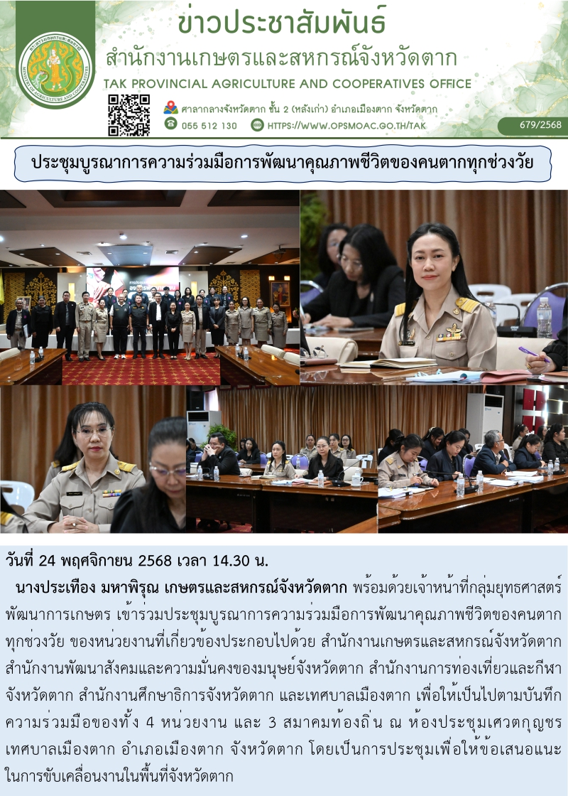 นางประเทือง มหาพิรุณ เกษตรและสหกรณ์จังหวัดตาก พร้อมด้วยเจ้าหน้าที่กลุ่มยุทธศาสตร์พัฒนาการเกษตร เข้าร่วมประชุมบูรณาการความร่วมมือการพัฒนาคุณภาพชีวิตของคนตากทุกช่วงวัย ของหน่วยงานที่เกี่ยวข้องประกอบไปด้วย สำนักงานเกษตรและสหกรณ์จังหวัดตาก สำนักงานพัฒนาสังคมและความมั่นคงของมนุษย์จังหวัดตาก สำนักงานการท่องเที่ยวและกีฬาจังหวัดตาก สำนักงานศึกษาธิการจังหวัดตาก และเทศบาลเมืองตาก เพื่อให้เป็นไปตามบันทึกความร่วมมือของทั้ง 4 หน่วยงาน และ 3 สมาคมท้องถิ่น ณ ห้องประชุมเศวตกุญชร เทศบาลเมืองตาก อำเภอเมืองตาก จังหวัดตาก โดยเป็นการประชุมเพื่อให้ข้อเสนอแนะในการขับเคลื่อนงานในพื้นที่จังหวัดตาก