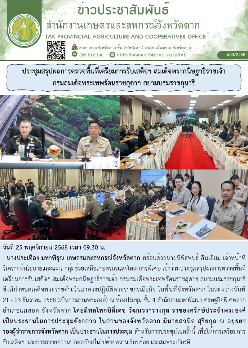 นางประเทือง มหาพิรุณ เกษตรและสหกรณ์จังหวัดตาก พร้อมด้วยนายนิพิธพนธ์ อินเอี่ยม เจ้าหน้าที่วิเคราะห์นโยบายและแผน กลุ่มช่วยเหลือเกษตรกรและโครงการพิเศษ เข้าร่วมประชุมสรุปผลการตรวจพื้นที่เตรียมการรับเสด็จฯ สมเด็จพระกนิษฐาธิราชเจ้า กรมสมเด็จพระเทพรัตนราชสุดาฯ สยามบรมราชกุมารี ซึ่งมีกำหนดเสด็จพระราชดำเนินมาทรงปฏิบัติพระราชกรณียกิจ ในพื้นที่จังหวัดตาก ในระหว่างวันที่ 21 - 23 ธันวาคม 2568 (เป็นการส่วนพระองค์) ณ ห้องประชุม ชั้น 4 สำนักงานเขตพัฒนาเศรษฐกิจพิเศษตาก อำเภอแม่สอด จังหวัดตาก โดยมีพลโทกษิดิ์เดช วัฒนวรารางกุล ราชองครักษ์ประจำพระองค์ เป็นประธานในการประชุมดังกล่าว ในส่วนของจังหวัดตาก มีนายสวนิต สุริยกุล ณ อยุธยา รองผู้ว่าราชการจังหวัดตาก เป็นประธานในการประชุม สำหรับการประชุมในครั้งนี้ เพื่อให้การเตรียมการรับเสด็จฯ และการถวายความปลอดภัยเป็นไปด้วยความเรียบร้อยและสมพระเกียรติ