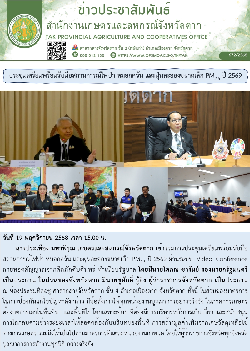 นางประเทือง มหาพิรุณ เกษตรและสหกรณ์จังหวัดตาก เข้าร่วมการประชุมเตรียมพร้อมรับมือสถานการณ์ไฟป่า หมอกควัน และฝุ่นละอองขนาดเล็ก PM2.5 ปี 2569 ผ่านระบบ Video Conferenceถ่ายทอดสัญญาณจากตึกภักดีบดินทร์ ทำเนียบรัฐบาล โดยมีนายโสภณ ซารัมย์ รองนายกรัฐมนตรี เป็นประธาน ในส่วนของจังหวัดตาก มีนายชูศักดิ์ รู้ยิ่ง ผู้ว่าราชการจังหวัดตาก เป็นประธาน ณ ห้องประชุมทีลอซู ศาลากลางจังหวัดตาก ชั้น 4 อำเภอเมืองตาก จังหวัดตาก ทั้งนี้ ในส่วนของมาตรการในการป้องกันแก้ไขปัญหาดังกล่าว มีข้อสั่งการให้ทุกหน่วยงานบูรณาการอย่างจริงจัง ในภาคการเกษตร ต้องลดการเผาในพื้นที่นา และพื้นที่ไร่ โดยเฉพาะอ้อย ที่ต้องมีการบริหารหลังการเก็บเกี่ยว และสนับสนุนการไถกลบตามช่วงระยะเวลาให้สอดคล้องกับบริบทของพื้นที่ การสร้างมูลค่าเพิ่มจากเศษวัสดุเหลือใช้ทางการเกษตร รวมถึงให้เป็นไปตามมาตรการที่แต่ละหน่วยงานกำหนด โดยให้ผู้ว่าราชการจังหวัดทุกจังหวัด บูรณาการการทำงานทุกมิติ อย่างจริงจัง