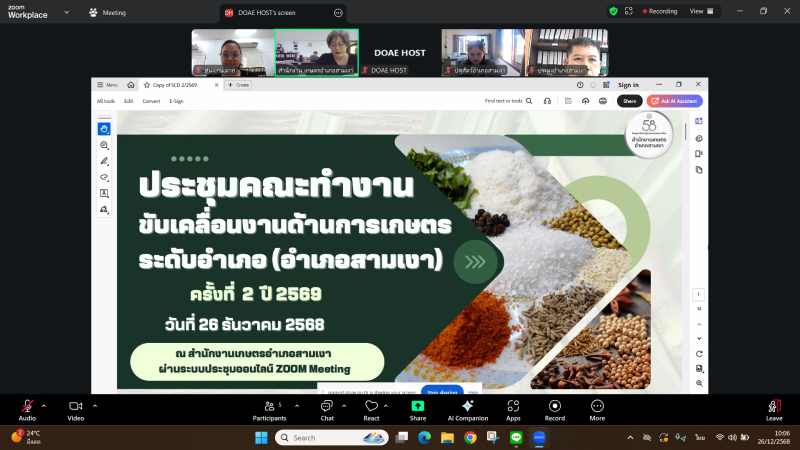 นางประเทือง มหาพิรุณ เกษตรและสหกรณ์จังหวัดตาก มอบหมายให้ นางสาวกรรณิกานต์ ทิใหม่ธง นักวิเคราะห์นโยบายและแผนชำนาญการ กลุ่มยุทธศาสตร์พัฒนาการเกษตร เข้าร่วมการประชุมคณะทำงานขับเคลื่อนงานด้านการเกษตรระดับอำเภอ (SCD) อำเภอสามเงา ผ่านสื่ออิเล็กทรอนิกส์ ณ ห้องปฏิบัติงานกลุ่มยุทธศาสตร์พัฒนาการเกษตร สำนักงานเกษตรและสหกรณ์จังหวัดตาก ชั้น 2 ศาลากลางจังหวัดตาก อำเภอเมืองตาก จังหวัดตาก โดยมี นางสุกัญญา ขุนอินทร์ เกษตรอำเภอสามเงา เป็นประธานการประชุมเพื่อพิจารณาคัดเลือกหมู่บ้านและสินค้าเกษตร ในการดำเนินการจัดทำแผนพัฒนาการเกษตรระดับหมู่บ้าน ภายใต้โครงการจัดเก็บข้อมูลด้านการเกษตรในระดับพื้นที่ โดยที่ประชุมมีมติคัดเลือกหมู่บ้านแม่ระวาน หมู่ 5 ตำบลยกกระบัตร อำเภอสามเงา จังหวัดตาก สินค้า “สมุนไพร” เข้าร่วมโครงการฯ