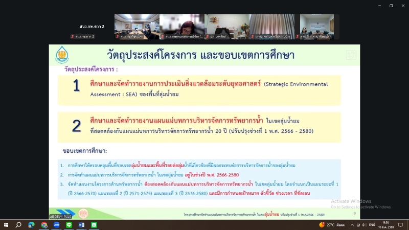 นางประเทือง มหาพิรุณ เกษตรและสหกรณ์จังหวัดตาก มอบหมายให้นางสาวลำพึง นาวีเสถียร นักวิเคราะห์นโยบายและแผนชำนาญการ กลุ่มยุทธศาสตร์พัฒนาการเกษตร เข้าร่วมการประชุมปฐมนิเทศโครงการศึกษาจัดทำแผนแม่บทการบริหารจัดการทรัพยากรน้ำในเขตลุ่มน้ำยม ปรับปรุงช่วงที่ 1 (พ.ศ. 2566 - 2580) ผ่านระบบออนไลน์ โดยมีนายธีรยุทธ สำราญทรัพย์ รองผู้ว่าราชการจังหวัดสุโขทัย เป็นประธานในพิธีเปิดการประชุม เพื่อนำเสนอวัตถุประสงค์ ขอบเขตการศึกษา แนวทางการดำเนินงานของโครงการ พร้อมสร้างความรู้ความเข้าใจในกระบวนการ SEA ในการจัดทำแผนแม่บทระดับลุ่มน้ำ และชี้เป้าพื้นที่ปัญหาของพื้นที่ลุ่มน้ำและศักยภาพของพื้นที่ พร้อมทั้งเปิดโอกาสให้ผู้มีส่วนได้เสียแสดงความคิดเห็นและข้อเสนอแนะต่อโครงการตั้งแต่เริ่มต้นการศึกษา