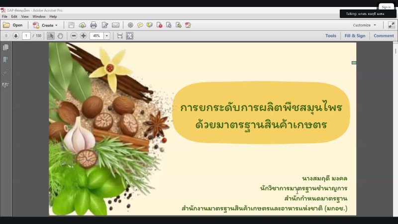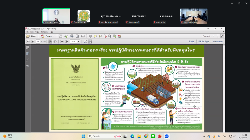นางประเทือง มหาพิรุณ เกษตรและสหกรณ์จังหวัดตาก มอบหมายให้ นางชลณัช ชัยประเดิมศักดิ์ หัวหน้ากลุ่มสารสนเทศการเกษตร พร้อมด้วยเจ้าหน้าที่กลุ่มสารสนเทศการเกษตร เข้าร่วมการประชุม สัมมนาเชิงปฏิบัติการ เรื่อง “เส้นทางมาตรฐานปรับแปลง GAP ให้ผ่านฉลุย พร้อมลุยทะเบียนผลิตภัณฑ์” ผ่านระบบการประชุมออนไลน์ (Zoom Meeting) โดยมี นางอมราพร ชีพสมุทร์ ผู้อํานวยการกองนโยบายเทคโนโลยีเพื่อการเกษตรและเกษตรกรรมยั่งยืน เป็นประธานในการประชุมดังกล่าว เพื่อเสริมสร้างความเข้าใจในการยกระดับคุณภาพสมุนไพรให้ผ่านการรับรองมาตรฐานสินค้าเกษตร เสริมสร้างความรู้ความเข้าใจในการขึ้นทะเบียนผลิตภัณฑ์สมุนไพร และสามารถถ่ายทอดสู่เกษตรกรที่เข้าร่วมโครงการส่งเสริมและพัฒนาสินค้าเกษตรชีวภาพ (สมุนไพร)