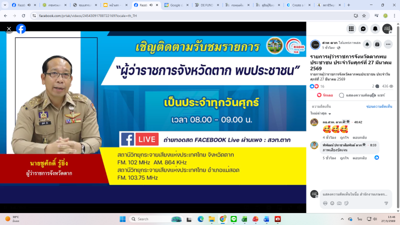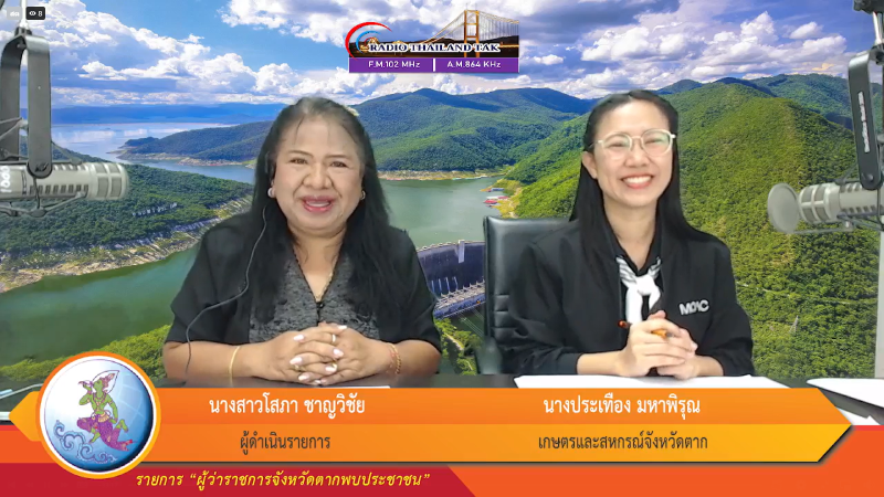 นางประเทือง มหาพิรุณ เกษตรและสหกรณ์จังหวัดตาก ร่วมจัดรายการวิทยุ ผู้ว่าราชการจังหวัดตาก พบประชาชน โดยมีคุณโสภา ชาญวิชัย เป็นผู้ดำเนินรายการ ในหัวข้อ การให้บริการของกระทรวงเกษตรและสหกรณ์ ณ สถานีวิทยุกระจายเสียงแห่งประเทศไทยจังหวัดตาก กระจายเสียงผ่านคลื่น A.M. 864 KHz หรือ F.M. 102 MHz และช่องทาง Facebook Live “สวท ตาก” ทั้งนี้ได้ประชาสัมพันธ์ถึงหน่วยงานในสังกัดกระทรวงเกษตรและสหกรณ์จังหวัดตาก เกี่ยวกับโครงสร้าง อำนาจ หน้าที่ ของหน่วยงานในสังกัด ศูนย์บริการเกษตรพิรุณราช มาตรการห้ามเผาเด็ดขาดของจังหวัดตาก มาตรการดำเนินการป้องกันและแก้ไขปัญหาฝุ่นละอองขนาดเล็ก PM2.5 ภาคการเกษตร มาตราการรับมือภัยแล้งเพื่อให้เกษตรกรและประชาชนทั่วไปได้รับทราบและวางแผนแนวทางการปฏิบัติ และประชาสัมพันธ์การเปลี่ยน ส.ป.ก. 4-01 เป็นโฉนดเพื่อการเกษตร โดยนางสาวสมร โสสีภา จากสำนักงานการปฏิรูปที่ดินจังหวัดตาก