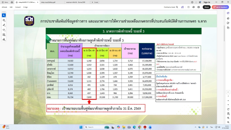 นางประเทือง มหาพิรุณ เกษตรและสหกรณ์จังหวัดตาก เป็นประธานการประชุมคณะกรรมการศูนย์ติดตามและแก้ไขปัญหาภัยพิบัติด้านการเกษตร จังหวัดตาก ครั้งที่ 3/2569 ถ่ายทอดสัญญาณจากห้องประชุมสำนักงานเกษตรและสหกรณ์จังหวัดตาก ศาลากลางจังหวัดตาก ชั้น 2 อำเภอเมืองตาก จังหวัดตาก และมอบหมายให้เจ้าหน้าที่กลุ่มช่วยเหลือเกษตรกรและโครงการพิเศษ เป็นผู้ดำเนินการจัดประชุมดังกล่าว เพื่อติดตามสถานการณ์และผลกระทบจากภัยพิบัติด้านการเกษตรในพื้นที่จังหวัดตาก การเฝ้าระวังภัยแล้ง การป้องกันการเผาในพื้นที่การเกษตร การดำเนินงานช่วยเหลือเกษตรกรผู้ประสบภัยพิบัติด้านการเกษตรของหน่วยงานที่เกี่ยวข้อง ในการเตรียมความพร้อม เฝ้าระวัง และการช่วยเหลือแก่เกษตรกร ผู้ประสบภัยพิบัติในพื้นที่จังหวัดตาก ให้เป็นไปด้วยความเรียบร้อย รวดเร็ว และตามระเบียบหลักเกณฑ์ต่างๆที่เกี่ยวข้องต่อไป