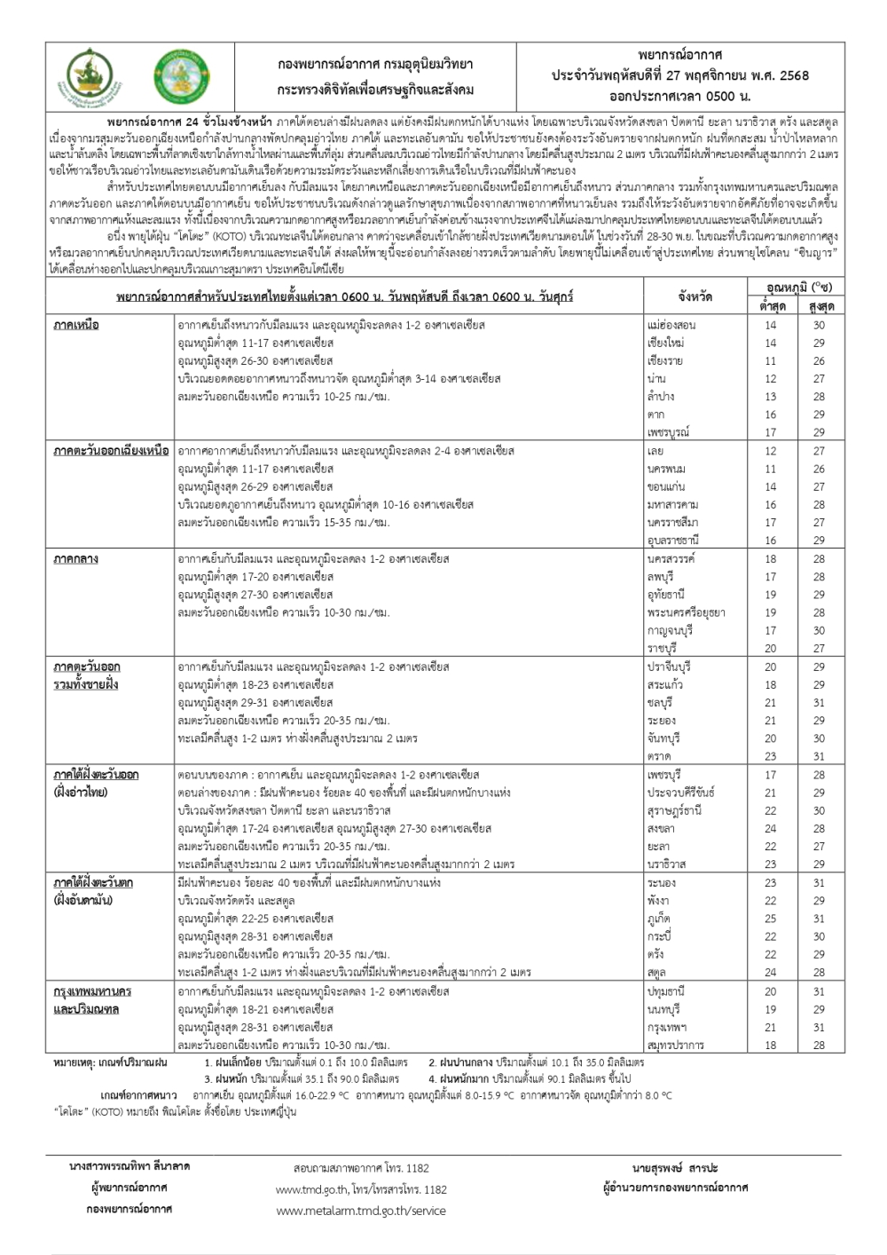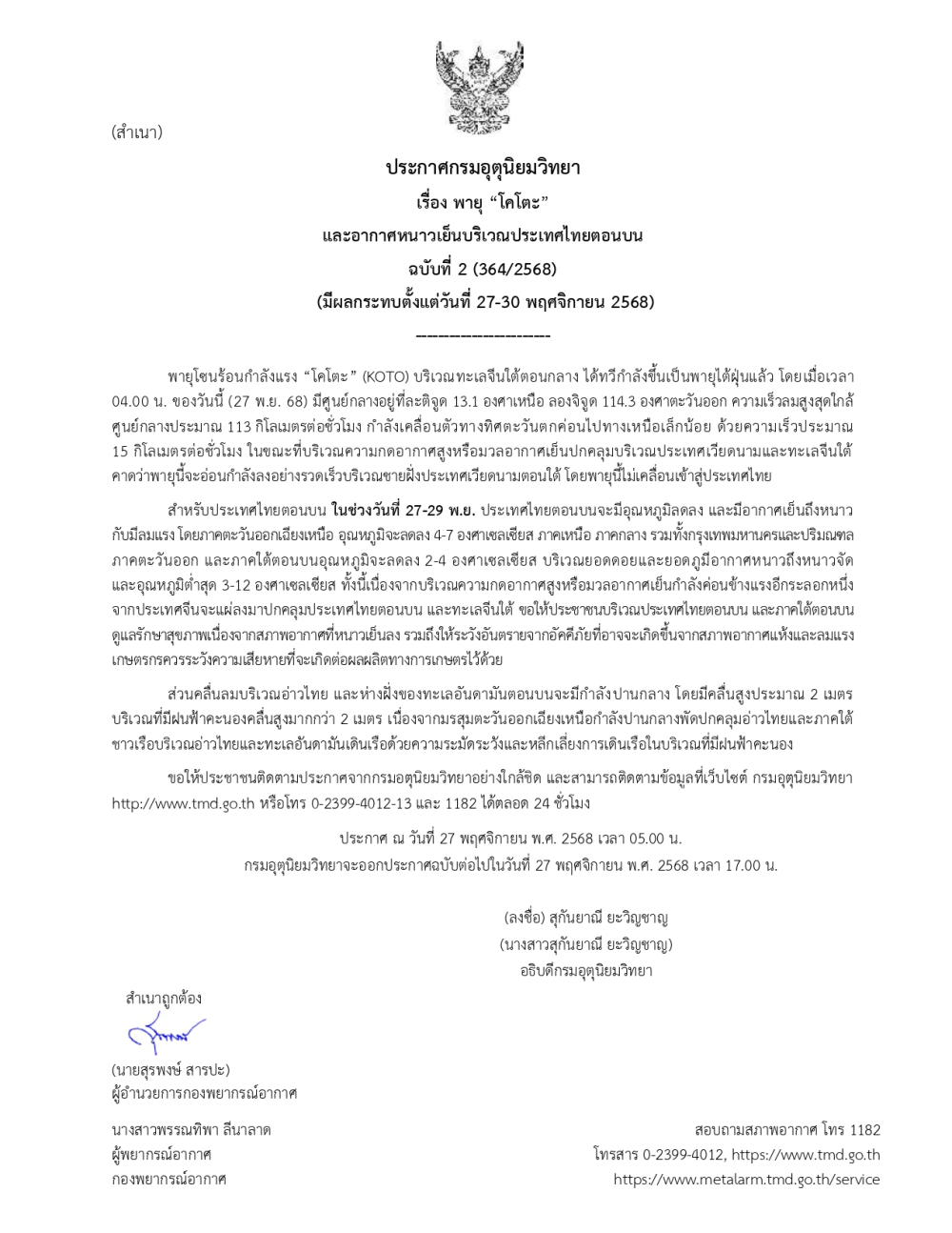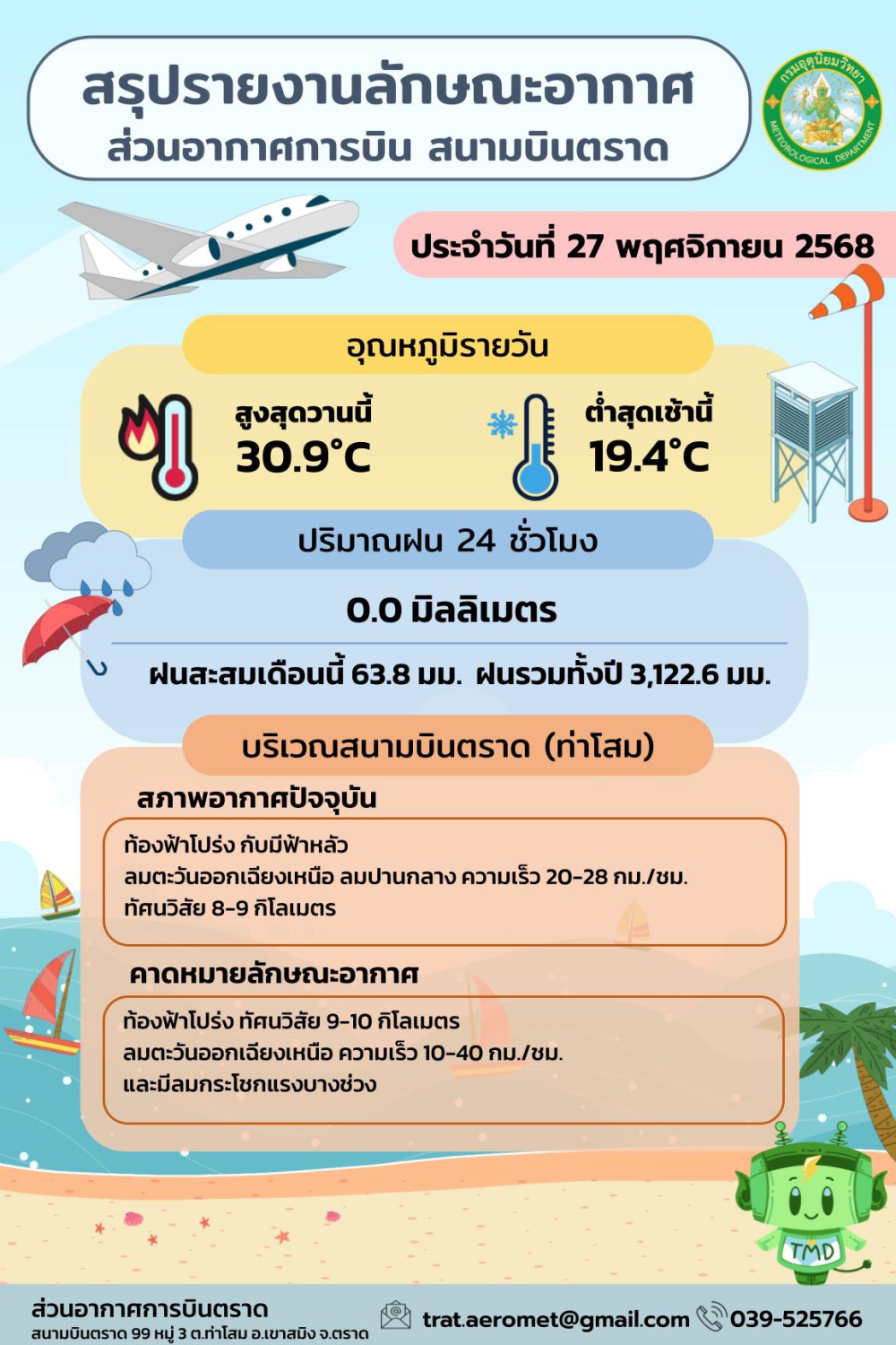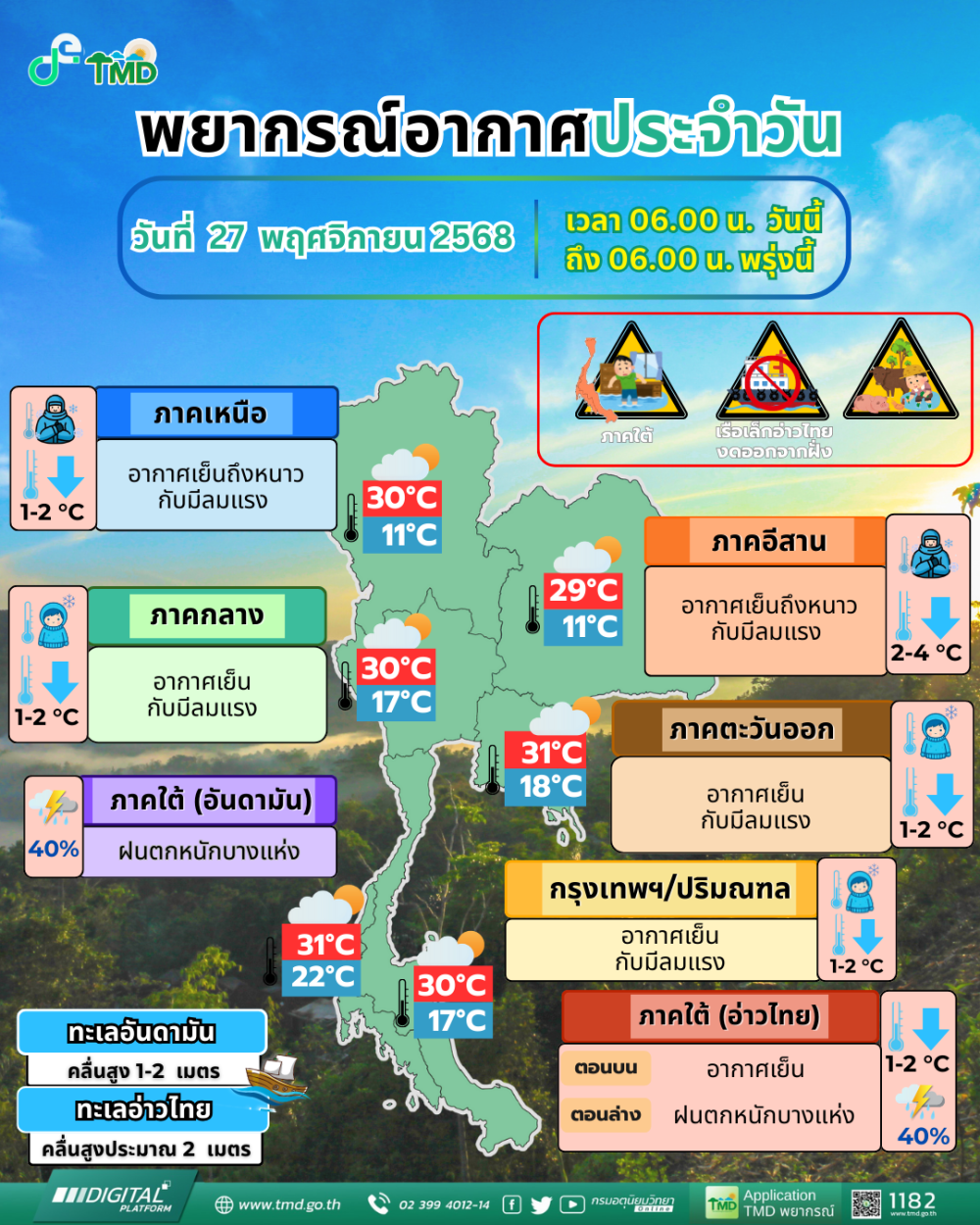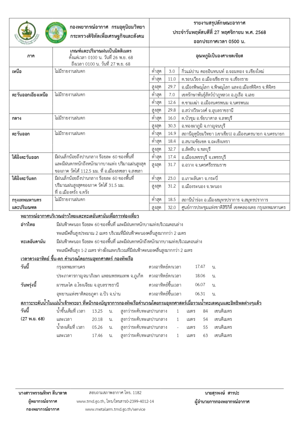 พยากรณ์อากาศประจำวันที่ 27 พฤศจิกายน 2568