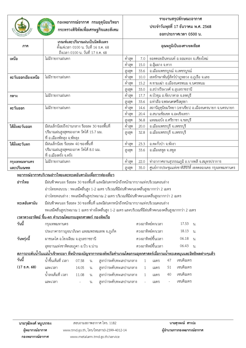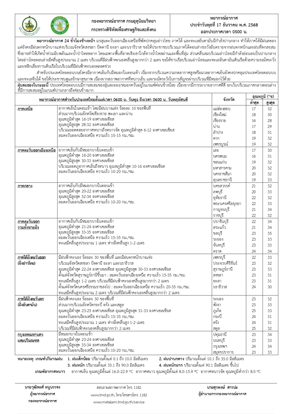 พยากรณ์อากาศประจำวันที่ 17 ธันวาคม 2568