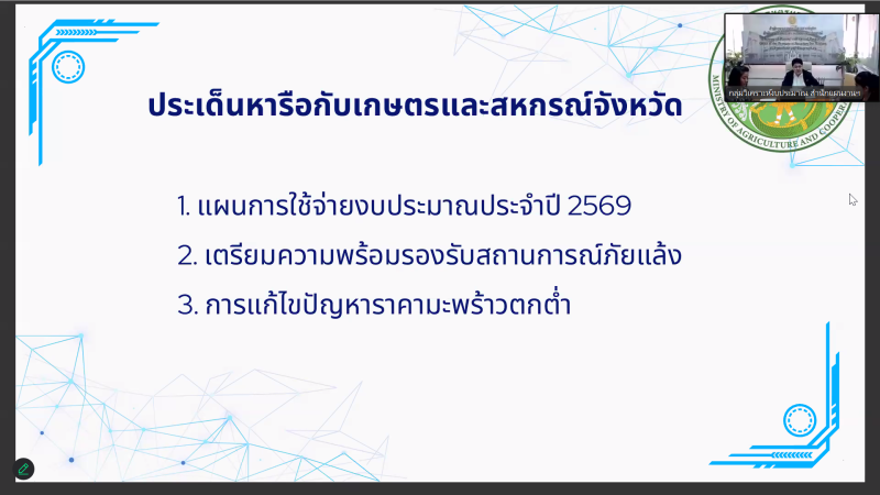 วันอังคารที่ 24 กุมภาพันธ์ 2569 นายนาวิน ป้องกัน เกษตรและสหกรณ์จังหวัดอุบลราชธานี พร้อมด้วยเจ้าหน้าที่ เข้าร่วมการประชุมหารือเพื่อเตรียมการบริหารงบประมาณ ปี 2569 ในช่วงครึ่งปีหลัง (เม.ย. -ก.ย. 2569) เพื่อหารือแผนการใช้จ่ายงบประมาณ ประจำปี 2569 การเตรียมความพร้อมรองรับสถานการณ์ภัยแล้ง และการแก้ไขปัญหาราคามะพร้าวตกต่ำ ผ่านระบบ Zoom ณ สำนักงานเกษตรและสหกรณ์จังหวัดอุบลราชธานี