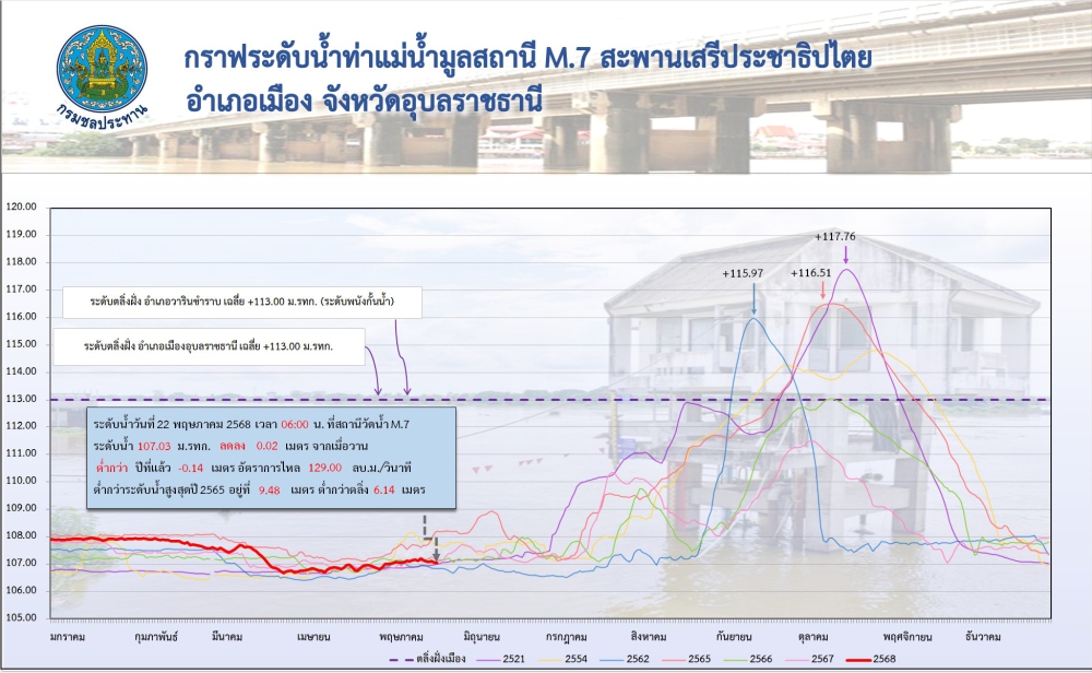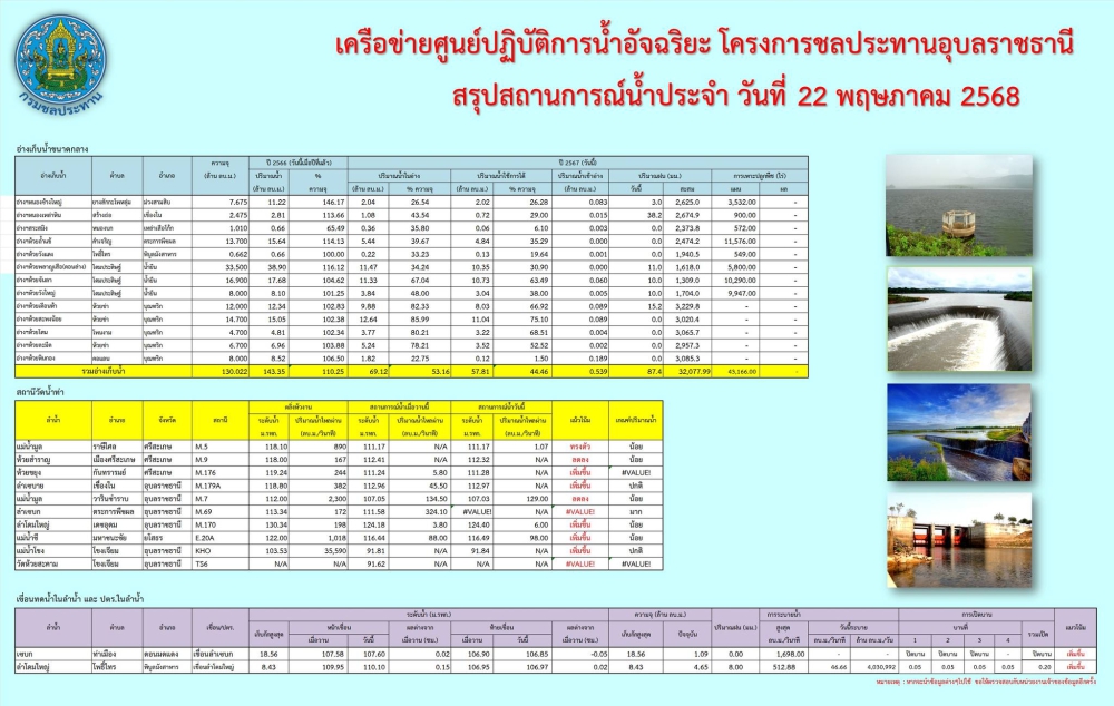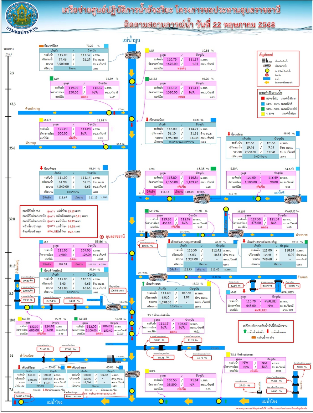 สรุปรายงานสถานการณ์น้ำในเขตจังหวัดอุบลราชธานี วันที่ 22 พฤษภาคม 2568