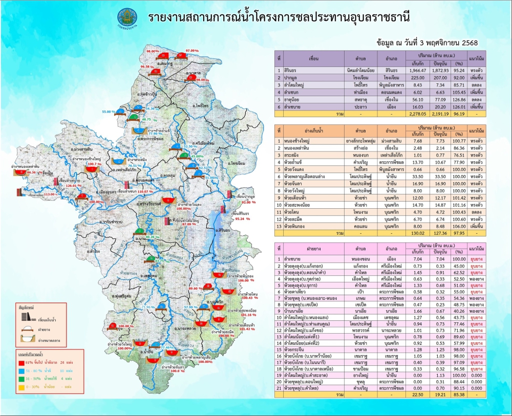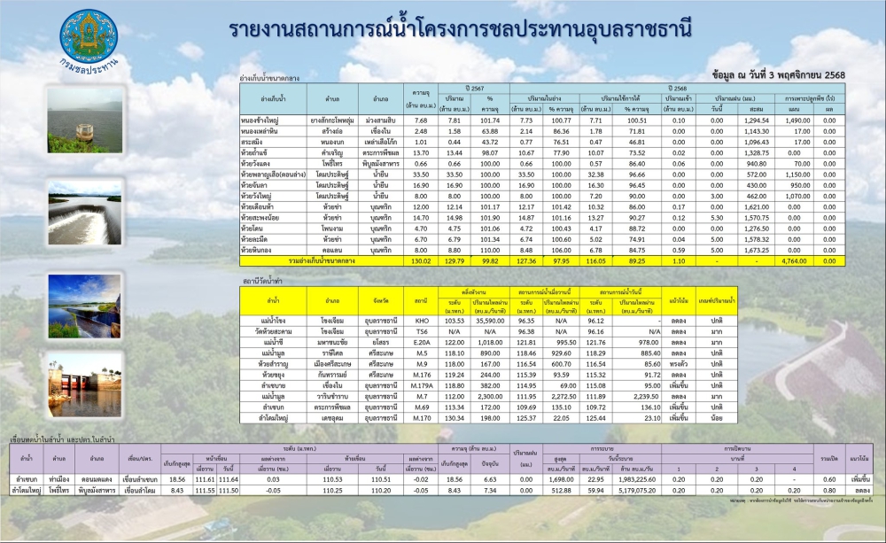 สรุปรายงานสถานการณ์น้ำในเขตจังหวัดอุบลราชธานี วันที่ 3 พฤศจิกายน 2568