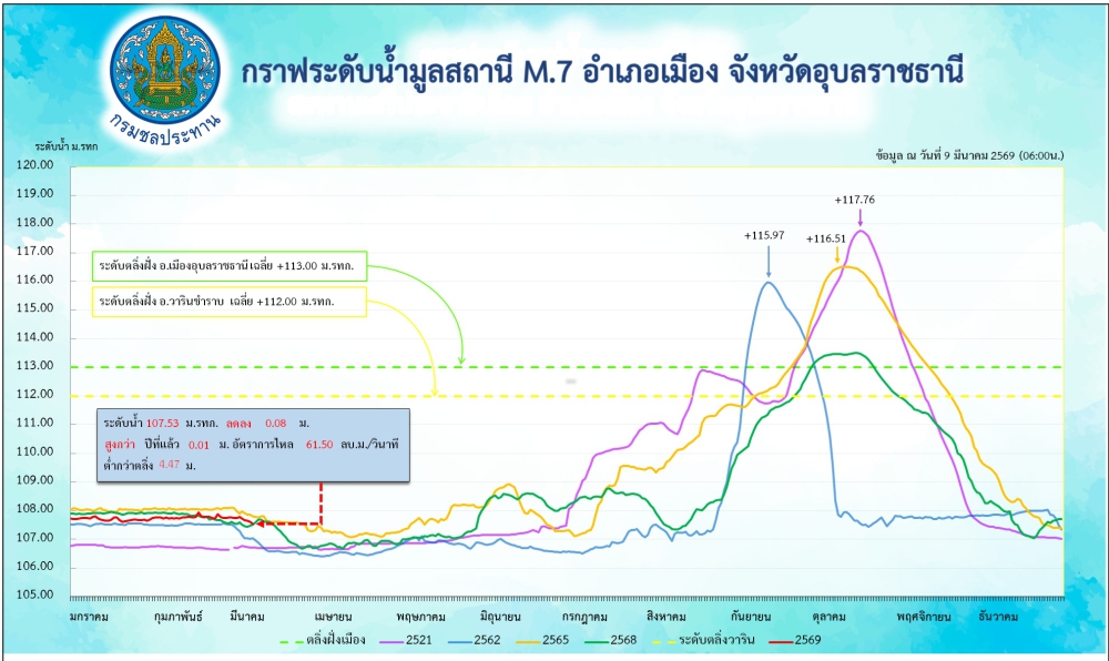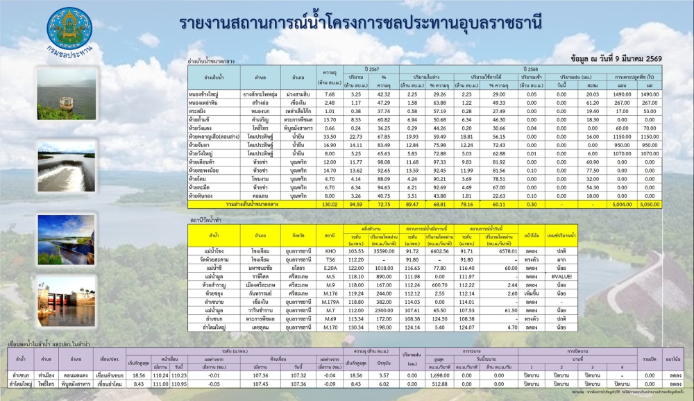 สรุปรายงานสถานการณ์น้ำในเขตจังหวัดอุบลราชธานี วันที่ 9 มีนาคม 2569