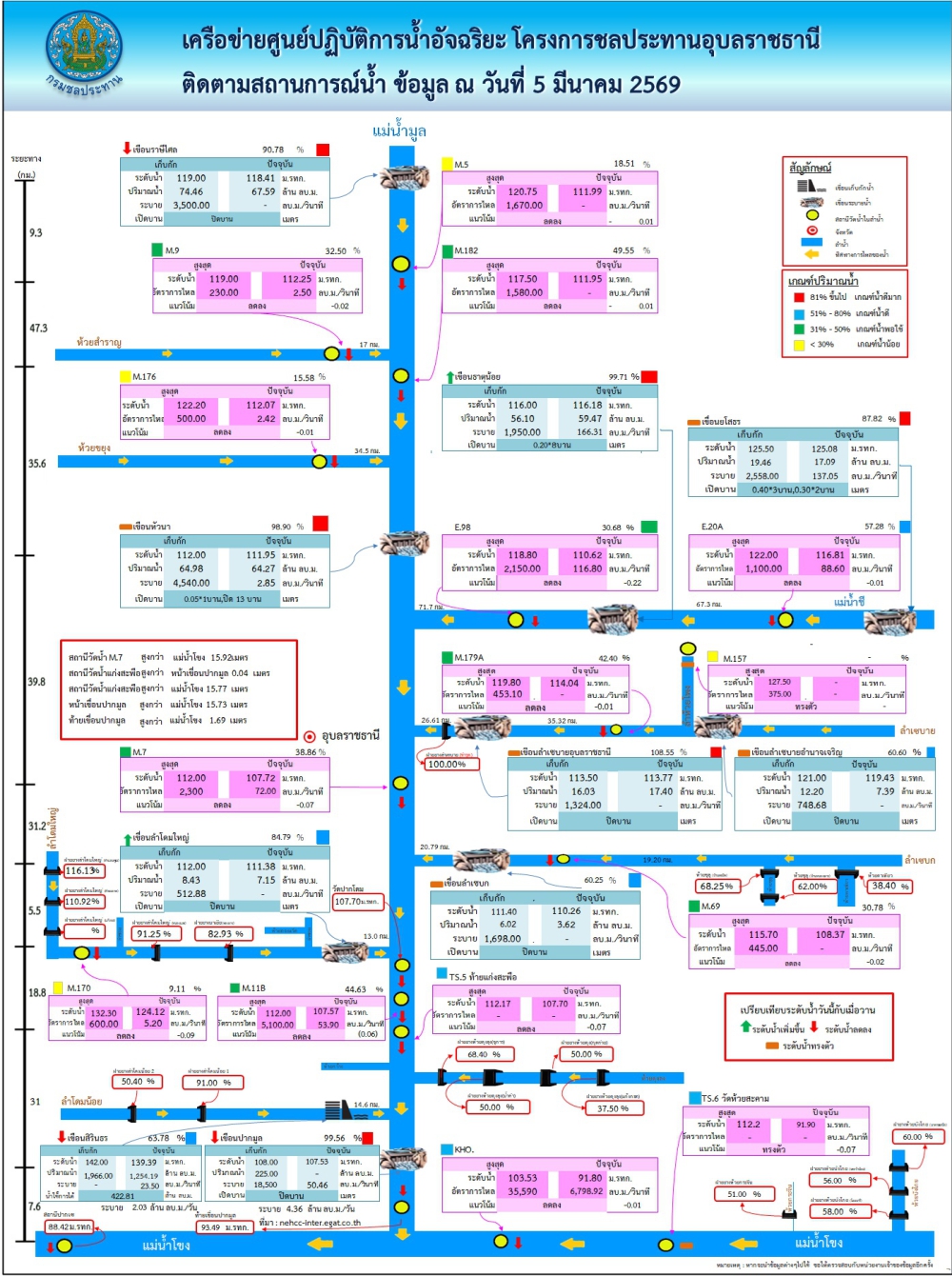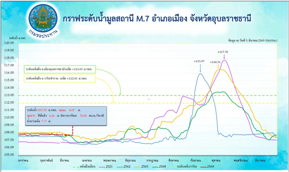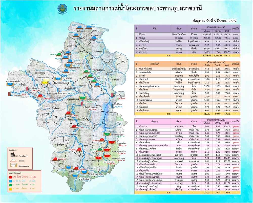 สรุปรายงานสถานการณ์น้ำในเขตจังหวัดอุบลราชธานี วันที่ 5 มีนาคม 2569