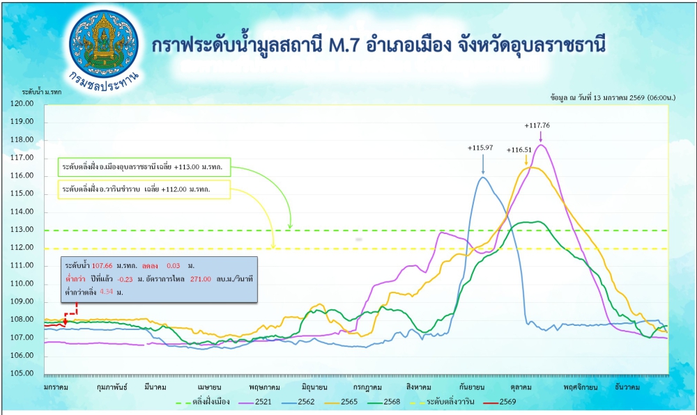 สรุปรายงานสถานการณ์น้ำในเขตจังหวัดอุบลราชธานี วันที่ 13 มกราคม 2569