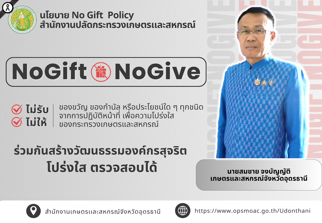 ประกาศกระทรวงเกษตรและสหกรณ์ เรื่อง เจตนารมณ์ไม่รับของขวัญของกำนัลทุกชนิดจากการปฏิบัติหน้าที่ (NO GIFT POLICY)