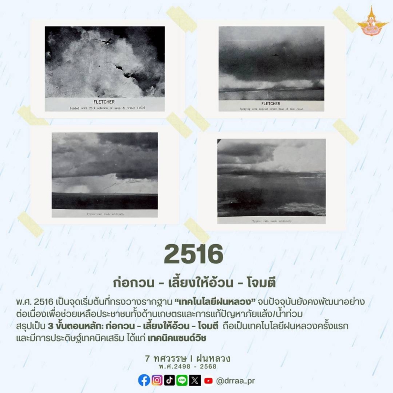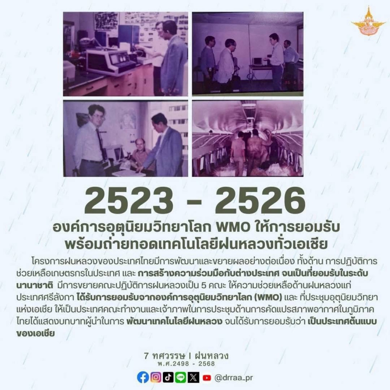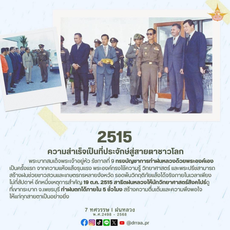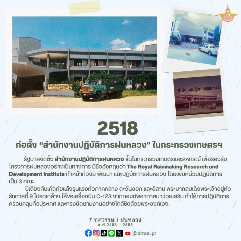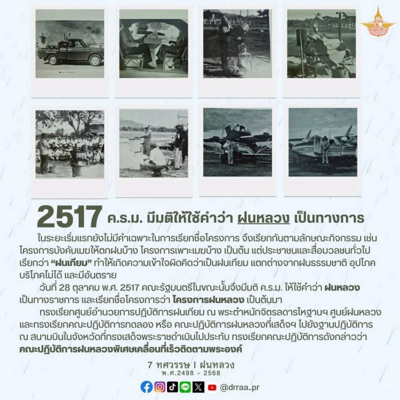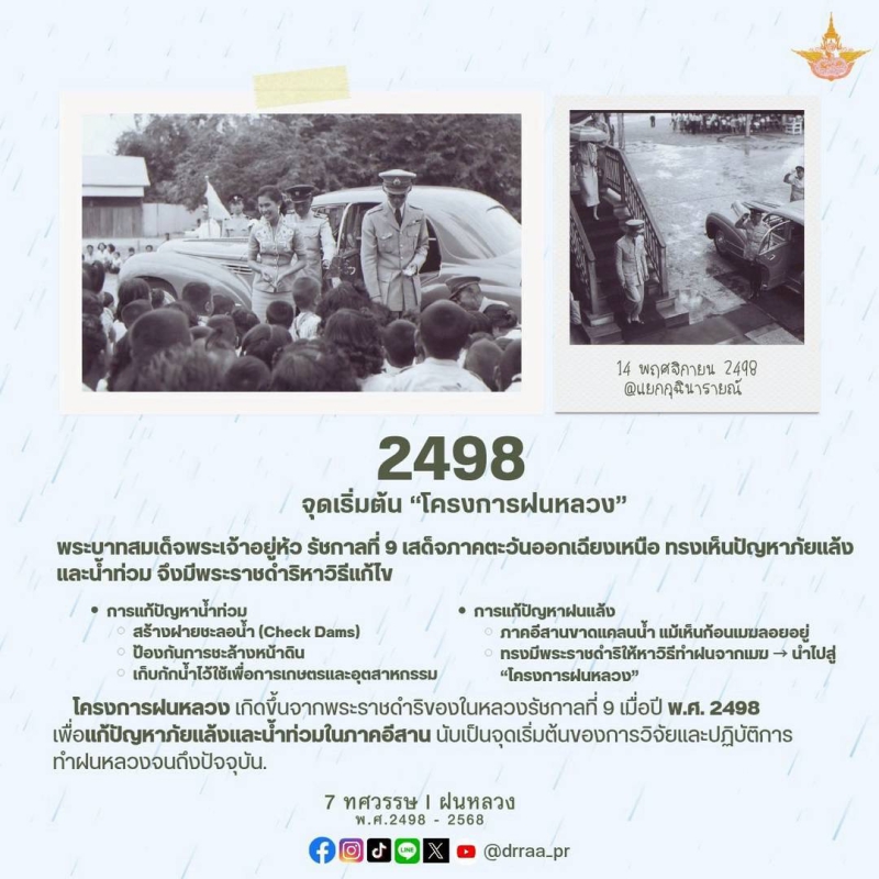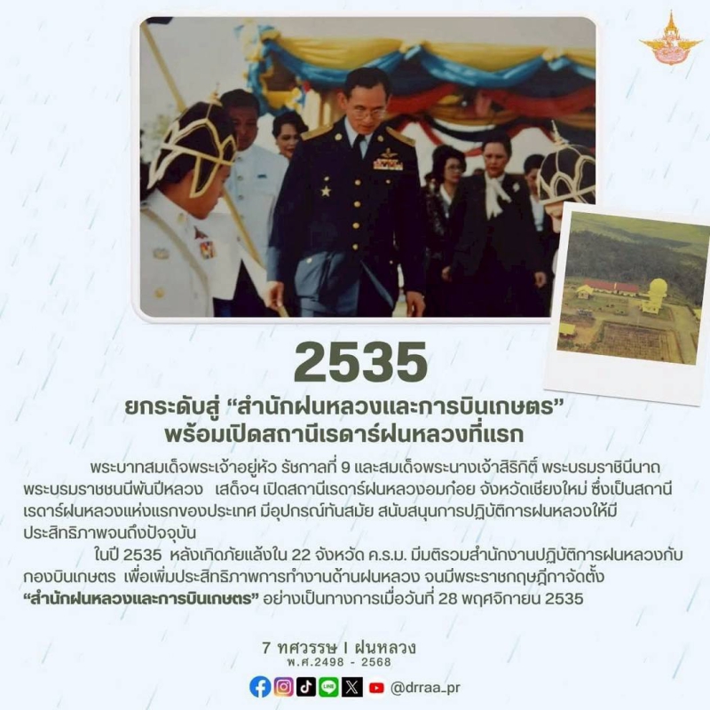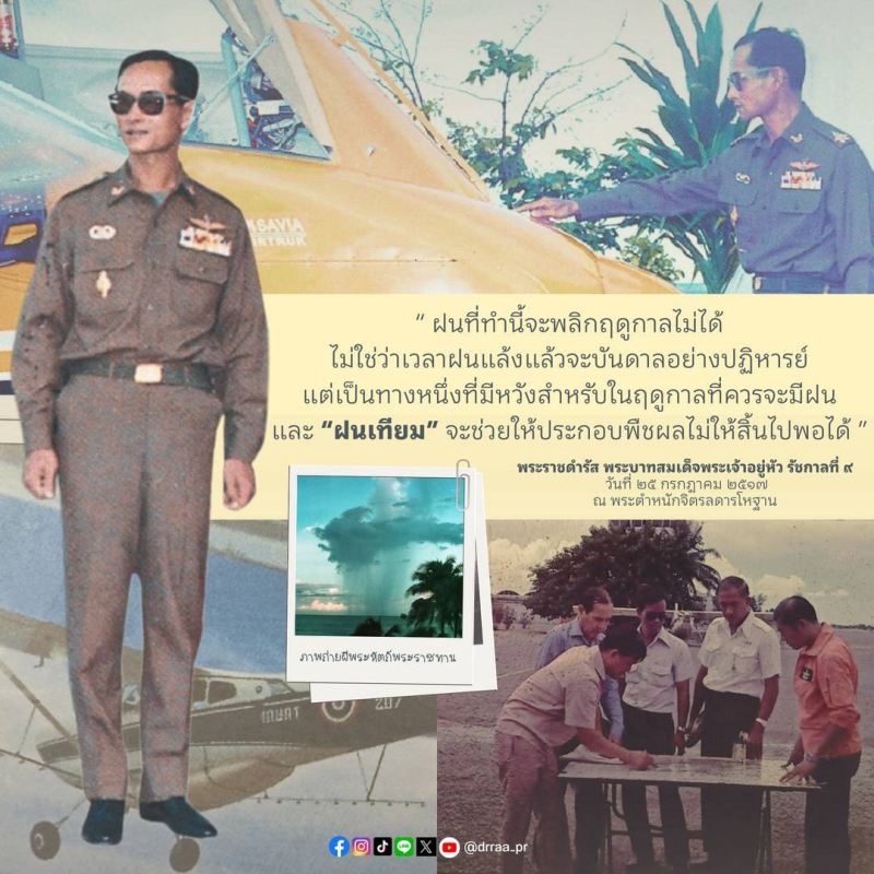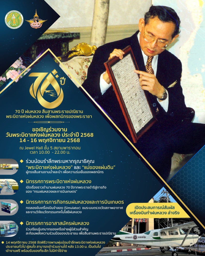 70 ปีแห่งการกำเนิดฝนหลวงพระราชทาน นับจากวันที่ 14 พฤศจิกายน 2498 เป็นวันที่พระบาทสมเด็จพระบรมชนกาธิเบศร มหาภูมิพลอดุลยเดชมหาราช บรมนาถบพิตร ทรงมีพระราชดำริที่จะคิดค้น วิจัย หาวิธีการทำฝนหลวงเพื่อแก้ไขปัญหาความทุกข์ยากของเกษตรกรและประชาชนทั่วไปที่ประสบภัยแล้ง ด้วยสำนึกในพระมหากรุณาธิคุณของพระองค์ท่าน คณะรัฐมนตรีจึงได้มีมติเมื่อวันที่ 20 สิงหาคม 2545 เฉลิมพระเกียรติพระองค์ท่าน ในฐานะทรงเป็น "พระบิดาแห่งฝนหลวง" และกำหนดให้วันที่ 14 พฤศจิกายนของทุกปีเป็น "วันพระบิดาแห่งฝนหลวง" เพื่อร่วมน้อมรำลึกในพระมหากรุณาธิคุณอันล้นพ้นหาที่สุดมิได้ และจารึกไว้เป็นวันสำคัญของประวัติศาสตร์ชาติไทย