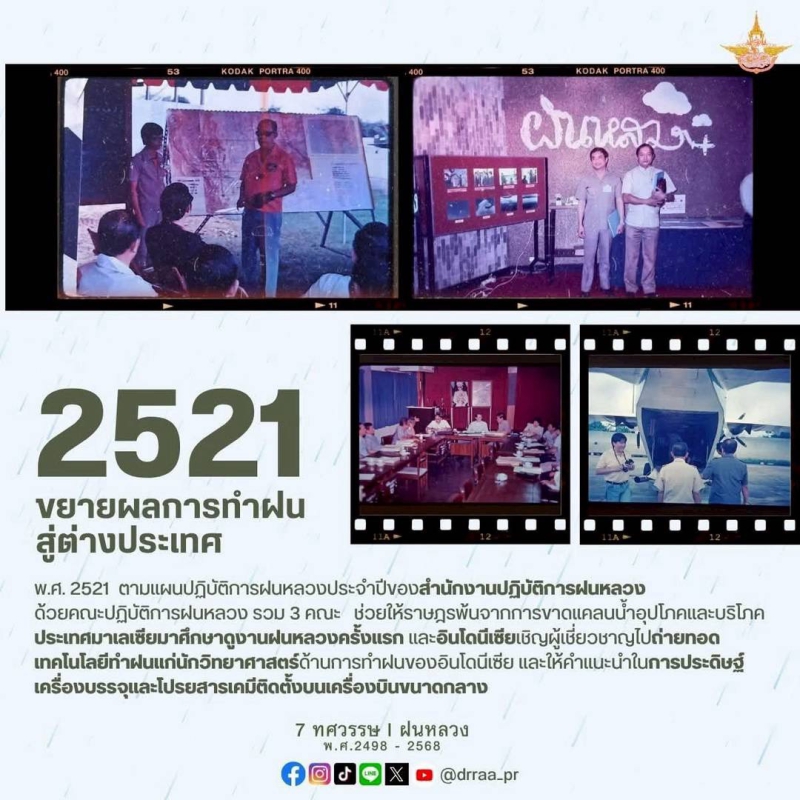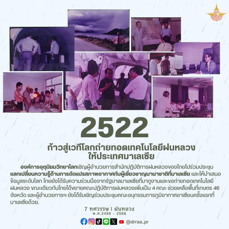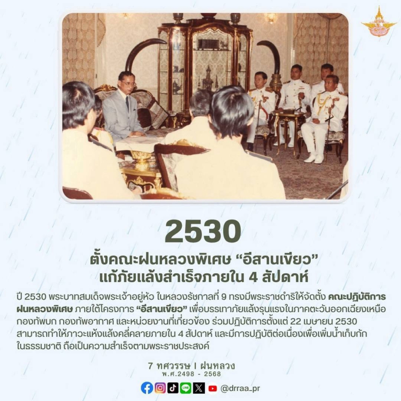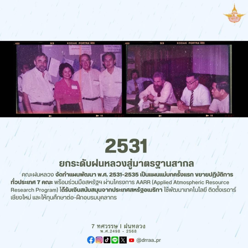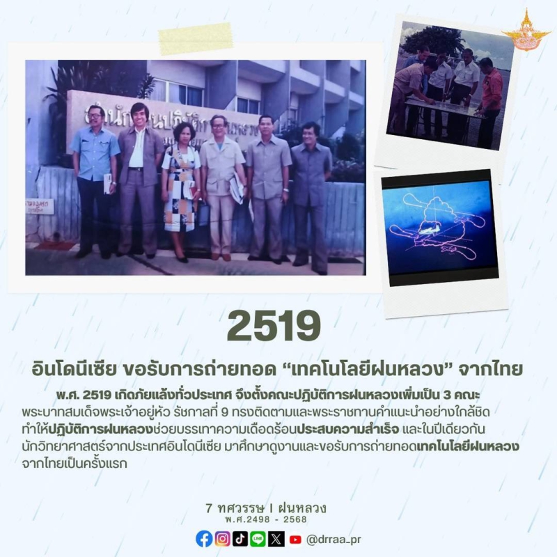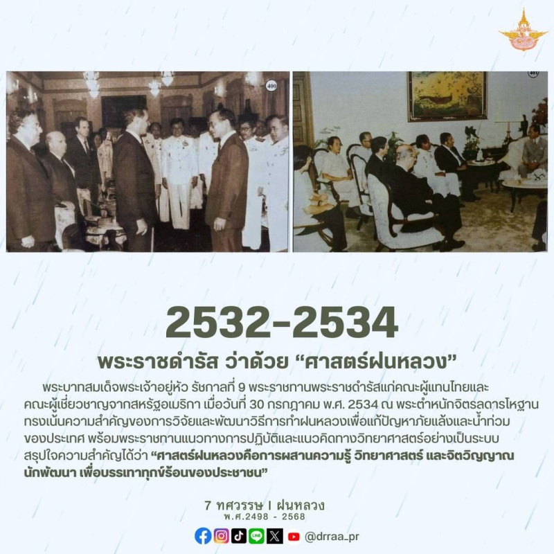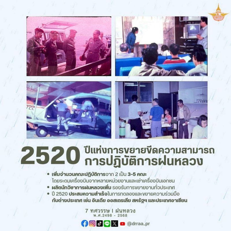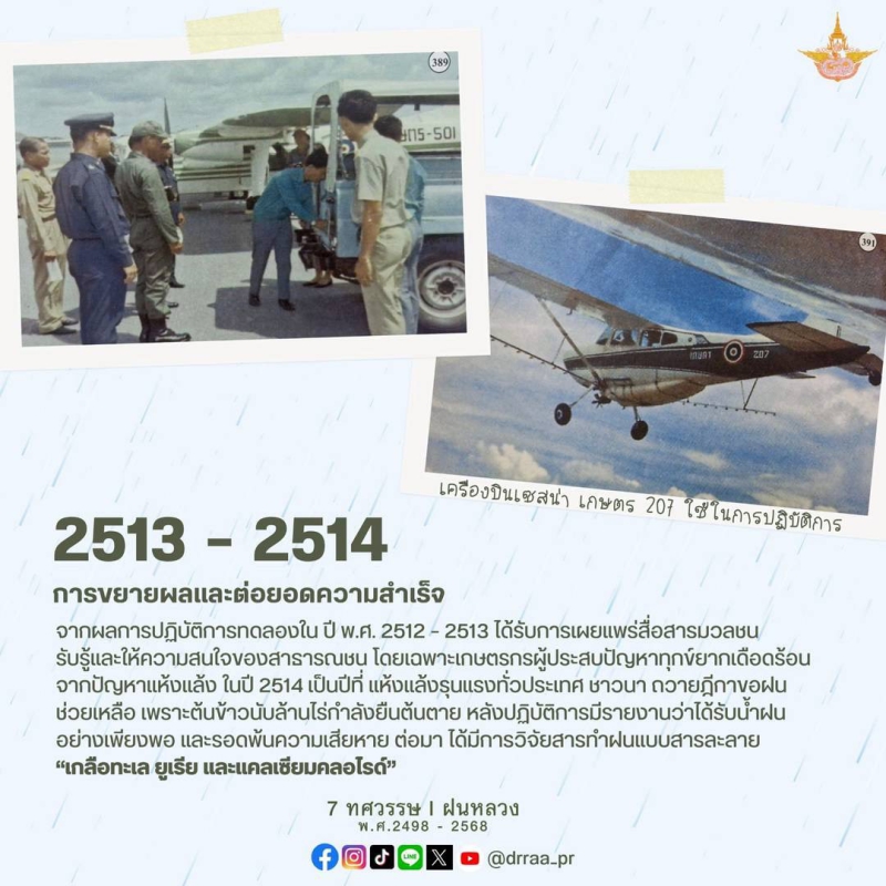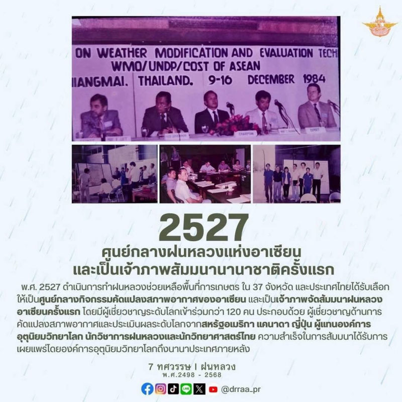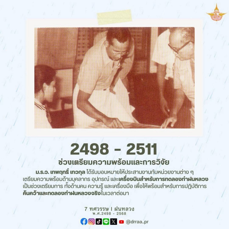 70 ปีแห่งการกำเนิดฝนหลวงพระราชทาน นับจากวันที่ 14 พฤศจิกายน 2498 เป็นวันที่พระบาทสมเด็จพระบรมชนกาธิเบศร มหาภูมิพลอดุลยเดชมหาราช บรมนาถบพิตร ทรงมีพระราชดำริที่จะคิดค้น วิจัย หาวิธีการทำฝนหลวงเพื่อแก้ไขปัญหาความทุกข์ยากของเกษตรกรและประชาชนทั่วไปที่ประสบภัยแล้ง ด้วยสำนึกในพระมหากรุณาธิคุณของพระองค์ท่าน คณะรัฐมนตรีจึงได้มีมติเมื่อวันที่ 20 สิงหาคม 2545 เฉลิมพระเกียรติพระองค์ท่าน ในฐานะทรงเป็น "พระบิดาแห่งฝนหลวง" และกำหนดให้วันที่ 14 พฤศจิกายนของทุกปีเป็น "วันพระบิดาแห่งฝนหลวง" เพื่อร่วมน้อมรำลึกในพระมหากรุณาธิคุณอันล้นพ้นหาที่สุดมิได้ และจารึกไว้เป็นวันสำคัญของประวัติศาสตร์ชาติไทย