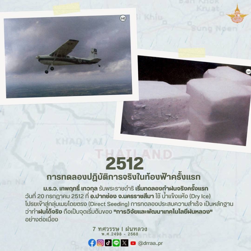 ต่อมา ได้มีปฏิบัติการโดยทดลองหยอดก้อนน้ำแข็งแห้ง ขนาดไม่เกิน 1 ลูกบาศก์นิ้ว เข้าไปในยอดเมฆสูงไม่เกิน 10,000 ฟุต ที่ลอยกระจัดกระจายอยู่เหนือพื้นที่ทดลองในขณะนั้น ทำให้กลุ่มเมฆทดลองเหล่านั้นมีการเปลี่ยนแปลงอย่างเห็นได้ชัด จนเกิดการกลั่นรวมตัวกันหนาแน่น และก่อยอดสูงขึ้นเป็นเมฆฝนขนาดใหญ่ในเวลาอันรวดเร็วแล้ว และจากการติดตามผลโดยการสำรวจทางภาคพื้นดิน ก็ได้รับรายงานยืนยันจากราษฎรว่า เกิดฝนตกลงสู่พื้นที่บริเวณวนอุทยานเขาใหญ่ในที่สุด การทดลองดังกล่าวจึงเป็นนิมิตหมายที่ดี ที่บ่งชี้ให้เห็นว่า การบังคับเมฆให้เกิดฝนเป็นสิ่งที่เป็นไปได้ และความสำเร็จดังกล่าวยังส่งผลให้มีการพัฒนา ปรับปรุง และต่อยอดโครงการฝนหลวงมาจนถึงปัจจุบัน