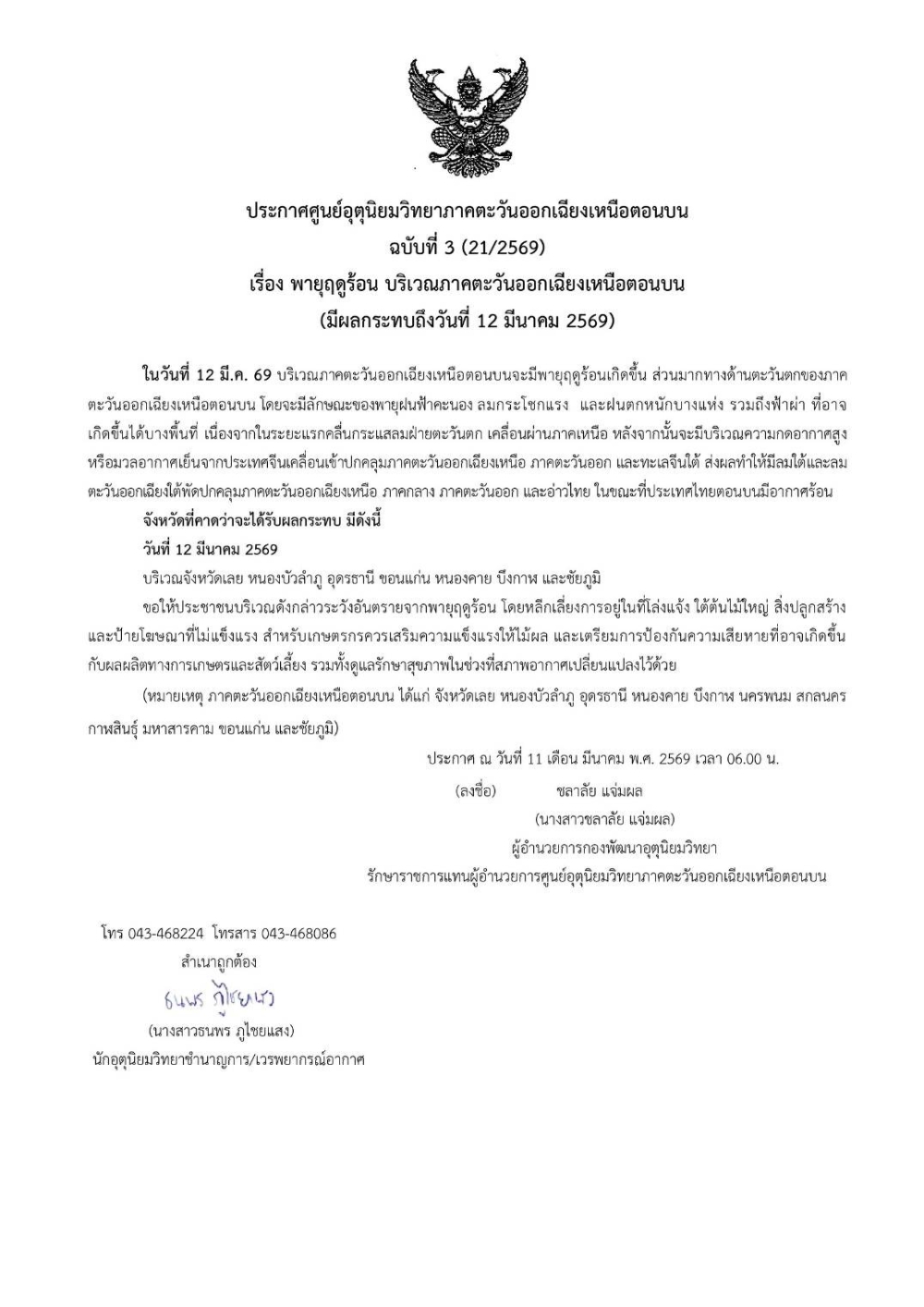 แจ้งเตือนพายุฤดูร้อน บริเวณภาคตะวันออกเฉียงเหนือ มีผลกระทบวันที่ 12 มีนาคม 2569