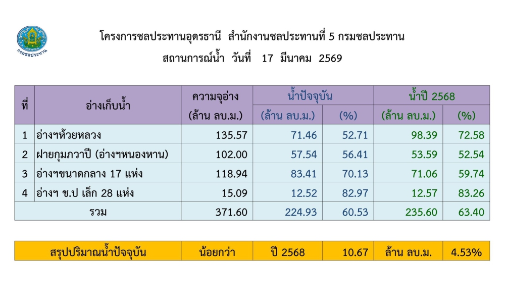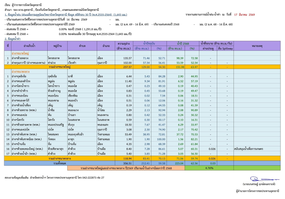รายงานสถานการณ์น้ำ จังหวัดอุดรธานี ประจำวันที่ 17 มีนาคม 2569