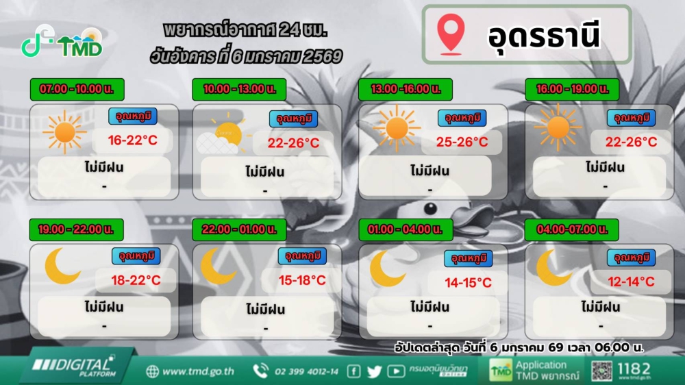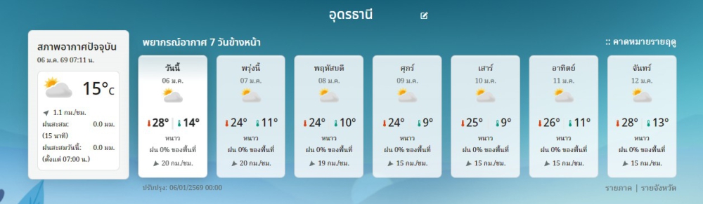 กรมอุตุนิยมวิทยา ออกประกาศศูนย์อุตุนิยมวิทยาภาคตะวันออกเฉียงเหนือตอนบน ฉบับที่ 2 (2/2569) ลงวันที่ 6 มกราคม 2569 เตือนอากาศหนาวจัดภาคตะวันออกเฉียงเหนือตอนบน ช่วงวันที่ 6 - 10 มกราคม 2569 อุณหภูมิลดสูงสุด 4-8 องศา
