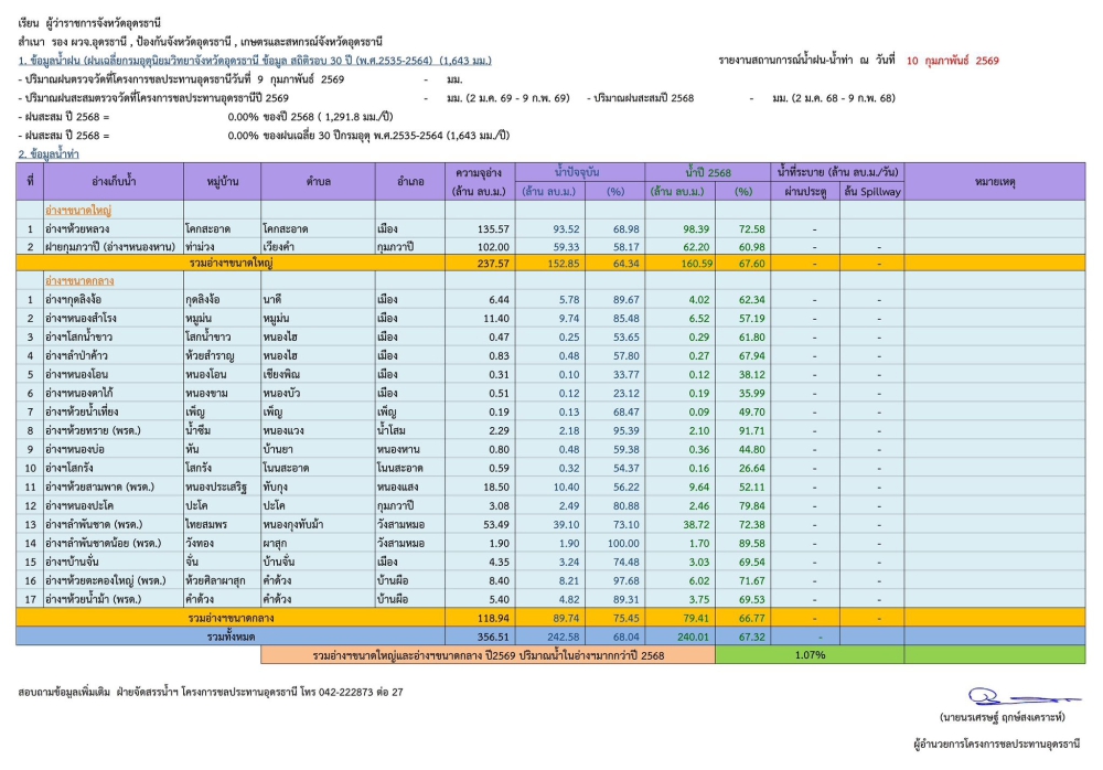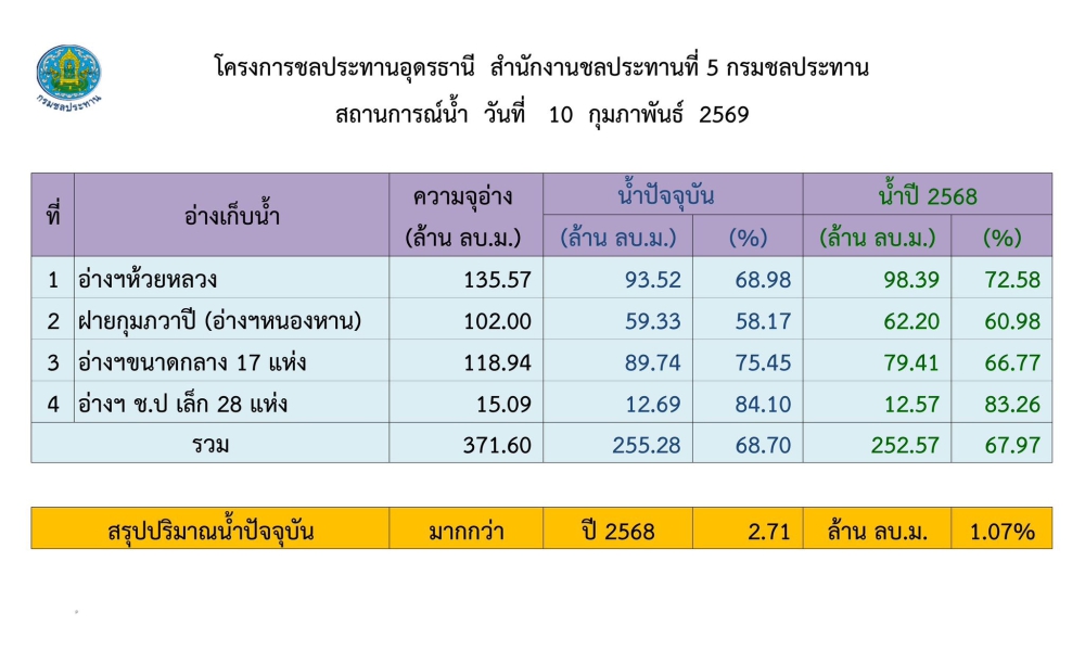 รายงานสถานการณ์น้ำ จังหวัดอุดรธานี ประจำวันที่ 10 กุมภาพันธ์ 2569