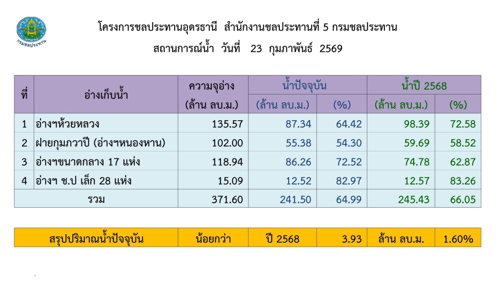รายงานสถานการณ์น้ำ จังหวัดอุดรธานี ประจำวันที่ 23 กุมภาพันธ์ 2569