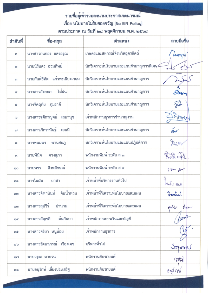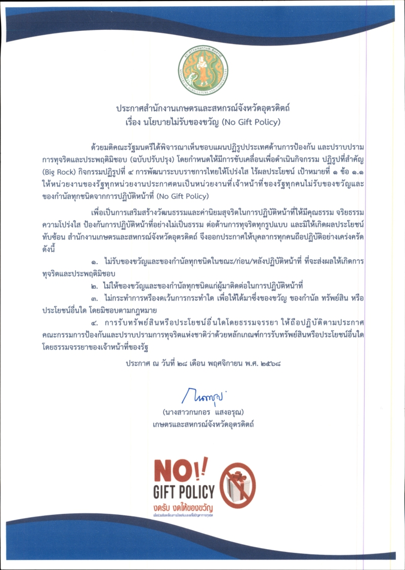 ประกาศเจตนารมณ์ไม่รับของขวัญเเละของกำนัลทุกชนิดจากการปฏิบัติหน้าที่ (No Gift Policy)
