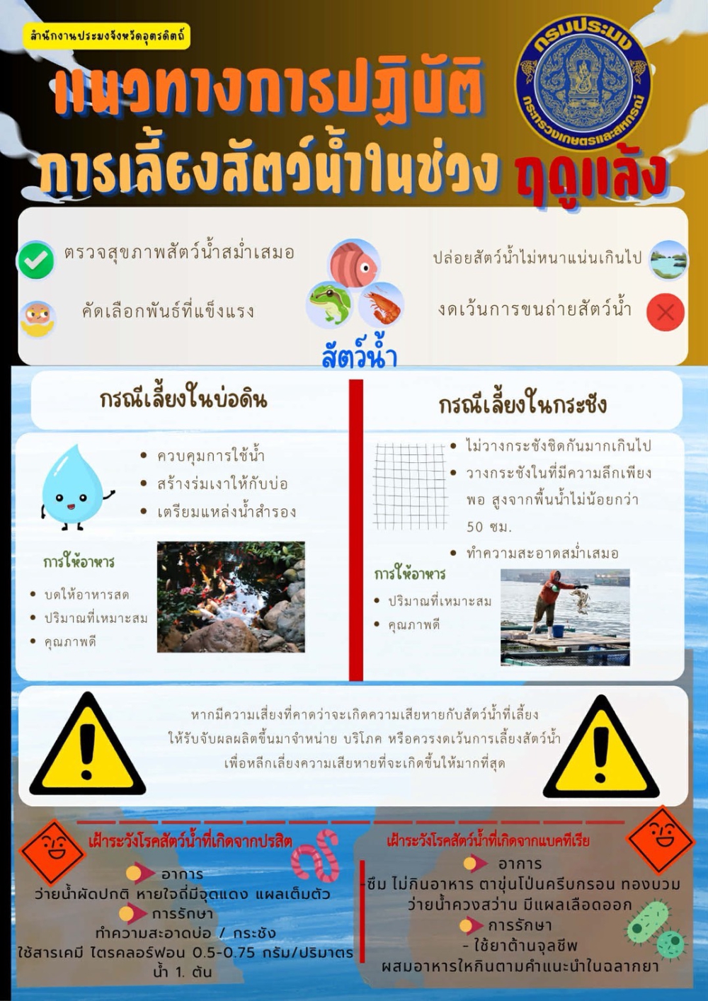 จังหวัดอุตรดิตถ์ เตือนเกษตรกรผู้เพาะเลี้ยงสัตว์น้ำรับมือภัยแล้ง เฝ้าระวังโรคช่วงอากาศร้อน กรมประมง โดยสำนักงานประมงจังหวัดอุตรดิตถ์ ออกประกาศเตือนเกษตรกรผู้เพาะเลี้ยงสัตว์น้ำ เตรียมความพร้อมรับสถานการณ์ภัยแล้งและสภาพอากาศร้อน ซึ่งอาจส่งผลกระทบต่อคุณภาพน้ำและทำให้สัตว์น้ำอ่อนแอ เสี่ยงต่อการเกิดโรคระบาดและการตายจำนวนมาก โรคที่ควรเฝ้าระวัง โรคจากปรสิต เช่น เห็บระฆัง เห็บปลา หนอนสมอ ทำให้ปลา ว่ายน้ำผิดปกติ หายใจถี่ มีจุดแดงหรือแผลตามลำตัว โรคติดเชื้อแบคทีเรีย เช่น โรคแผลตามตัว โรคตัวด่าง เชื้อสเตรปโตคอคคัส (Streptococcus sp.) แอโรโมแนส (Aeromonas hydrophila) และวิบริโอ (Vibrio sp.) ทำให้ปลาซึม เบื่ออาหาร ท้องบวม เกล็ดตั้ง มีแผลเลือดออก หากไม่รักษาอาจมีอัตราการตายสูง แนวทางการปฏิบัติช่วงฤดูแล้ง ปรับลดปริมาณการเลี้ยงหรือเว้นการเลี้ยงในช่วงเสี่ยง วางแผนการเลี้ยงให้เหมาะสมกับสภาพพื้นที่และฤดูกาล ควบคุมปริมาณน้ำในบ่อ รักษาคุณภาพน้ำ และจัดหาแหล่งน้ำสำรอง ลดความหนาแน่นสัตว์น้ำในบ่อ/กระชัง เลือกใช้พันธุ์สัตว์น้ำที่แข็งแรง และใช้อาหารคุณภาพดีในปริมาณเหมาะสม งดหรือหลีกเลี่ยงการขนย้ายสัตว์น้ำโดยไม่จำเป็น หมั่นสังเกตอาการผิดปกติอย่างใกล้ชิด และหากพบสัตว์น้ำป่วยให้แยกออก พร้อมปรึกษาสัตวแพทย์หรือเจ้าหน้าที่ประมงในพื้นที่ สำหรับเกษตรกรที่เลี้ยงในบ่อดิน ควรควบคุมการใช้น้ำ สร้างร่มเงา และเตรียมน้ำสำรอง ส่วนการเลี้ยงในกระชัง ควรจัดวางกระชังให้เหมาะสม มีความลึกเพียงพอ และทำความสะอาดสม่ำเสมอ สำนักงานประมงจังหวัดอุตรดิตถ์ ขอความร่วมมือเกษตรกรติดตามข่าวสารอย่างใกล้ชิด และปฏิบัติตามคำแนะนำอย่างเคร่งครัด เพื่อลดความเสี่ยงและความเสียหายที่อาจเกิดขึ้นในช่วงภัยแล้งนี้.