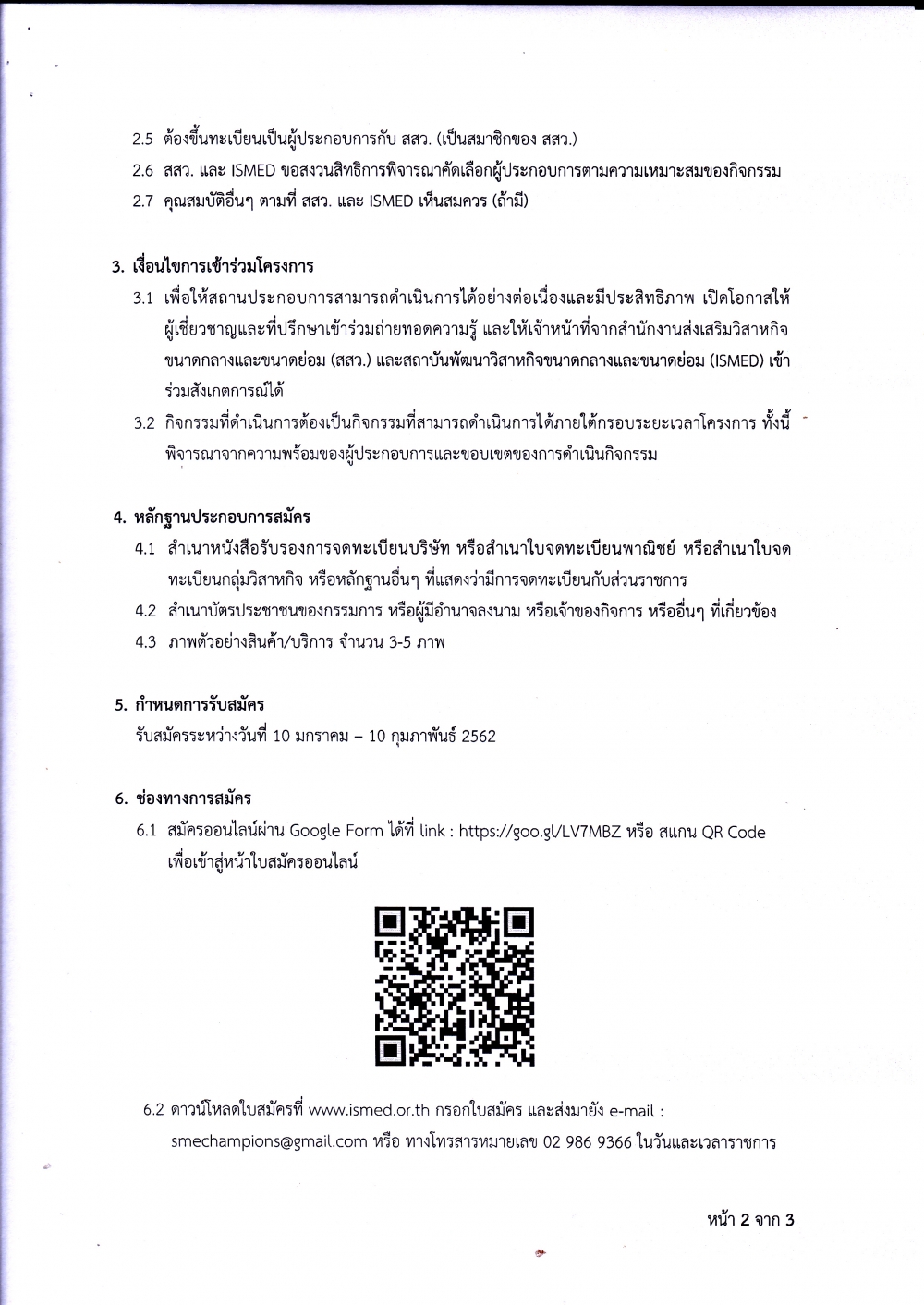 - ดาวน์โหลดใบสมัครที่ www.ismed.or.th กรอกใบสมัคร และส่งมายัง e-mail : smechampions@gmail.com หรือ ทางโทรสารหมายเลข 02 986 9366 ในวันและเวลาราชการ