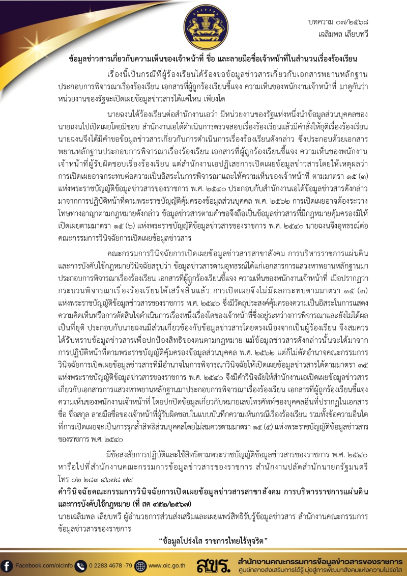 ความเห็นของเจ้าหน้าที่ ชื่อ และลายมือชื่อเจ้าหน้าที่ในสำนวนเรื่องร้องเรียน