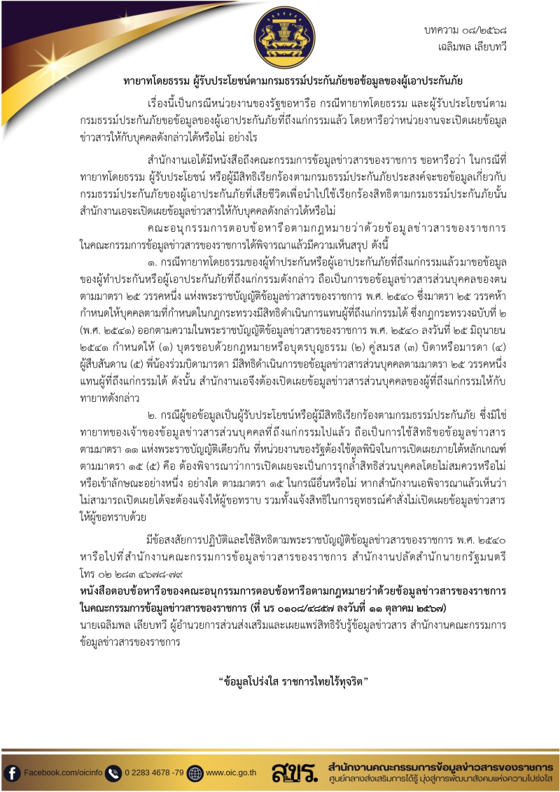 ทายาทโดยธรรม ผู้รับประโยชน์ตามกรมธรรม์ประกันภัยขอข้อมูลผู้เอาประกันภัย