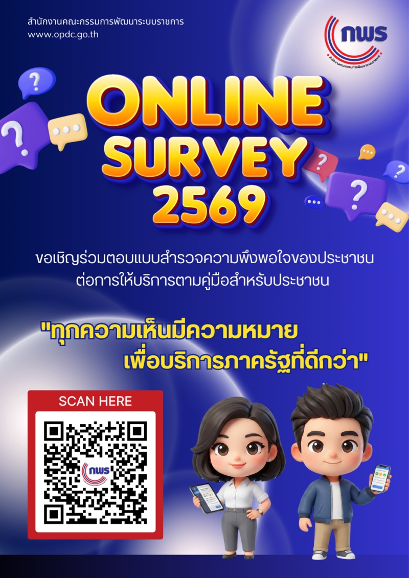 สำนักงาน ก.พ.ร. ขอเชิญร่วมตอบแบบสำรวจความพึงพอใจของประชาชนต่อการให้บริการของหน่วยงานของรัฐ ปี พ.ศ. 2569 เพื่อประโยชน์ในการพัฒนาบริการภาครัฐและอำนวยความสะดวกแก่ประชาชน โดยสามารถแสดงความเห็นได้ตั้งแต่วันนี้จนถึง 31 สิงหาคม 2569