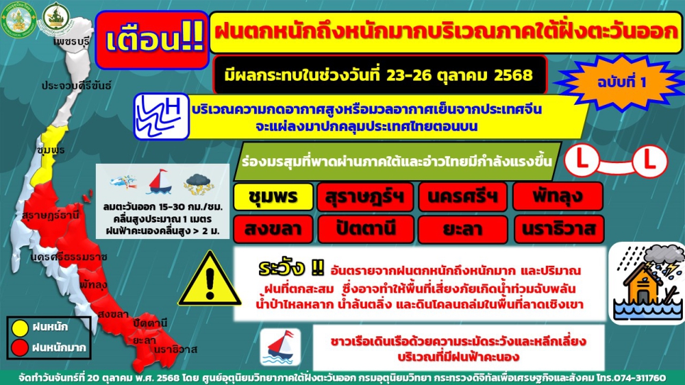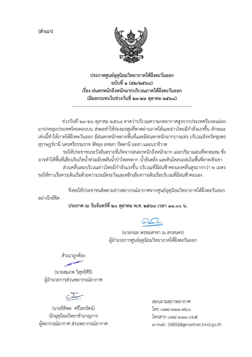 ประกาศศูนย์อุตุนิยมวิทยาภาคใต้ฝั่งตะวันออกฉบับที่ 1 (52/2568) เรื่อง ฝนตกหนักถึงหนักมากบริเวณภาคใต้ฝั่งตะวันออก (มีผลกระทบในช่วงวันที่ 23-26 ตุลาคม 2568)