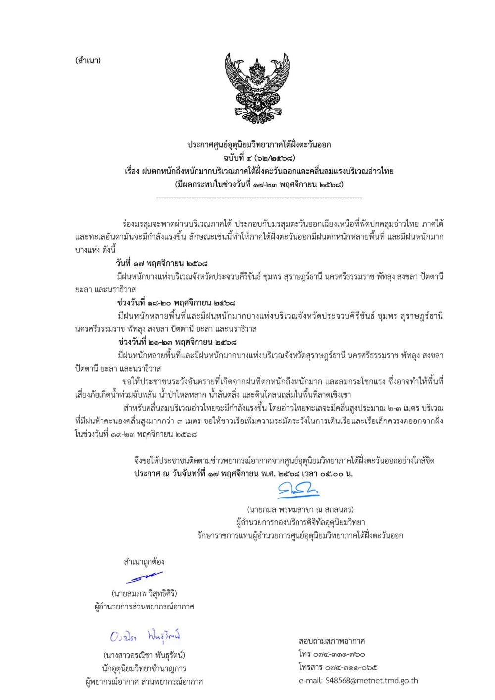 ประกาศศูนย์อุตุนิยมวิทยาภาคใต้ฝั่งตะวันออกฉบับที่ 4 (62/2568)เรื่อง ฝนตกหนักถึงหนักมากบริเวณภาคใต้ฝั่งตะวันออกและคลื่นลมแรงบริเวณอ่าวไทย(มีผลกระทบในช่วงวันที่ 17-23 พฤศจิกายน 2568)
