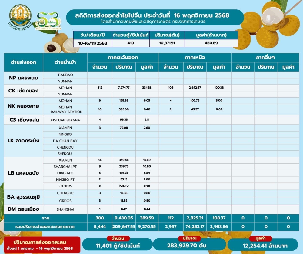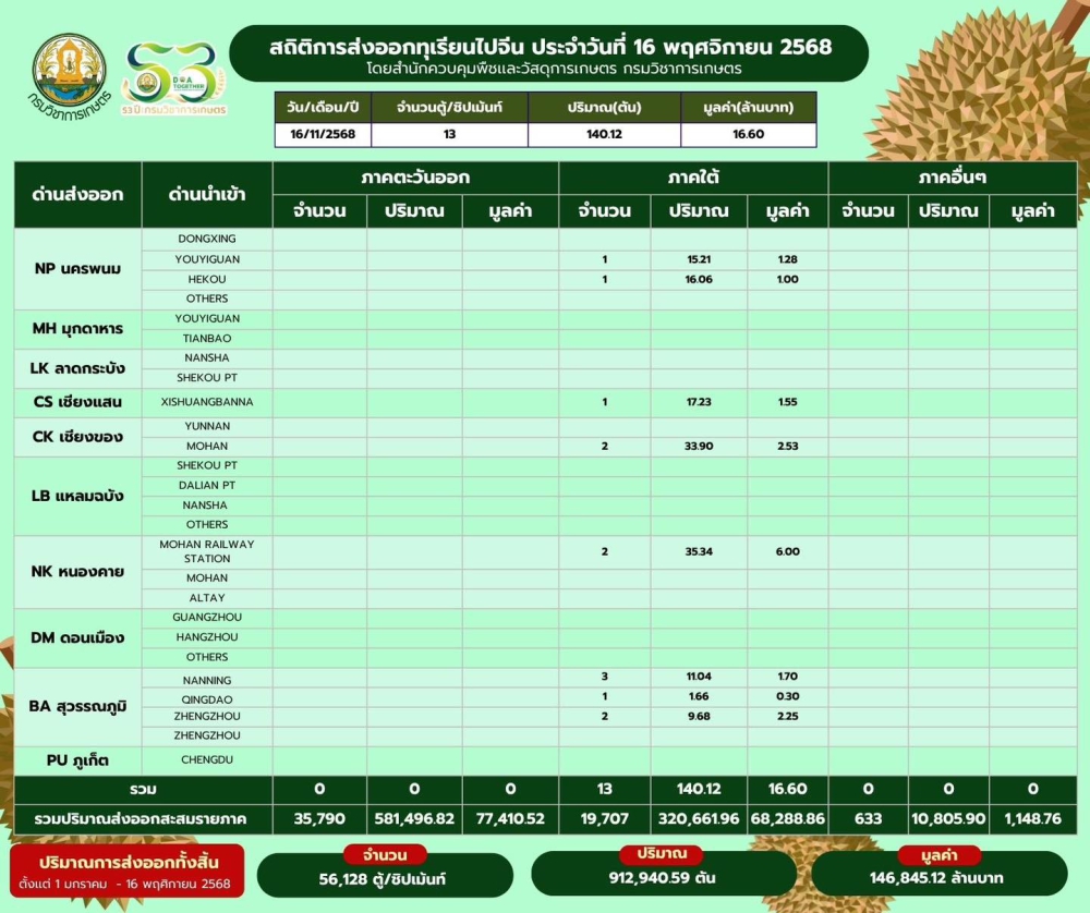 สถิติการส่งออกทุเรียนผลสด และลำไยไปสาธารณรัฐประชาชนจีนประจำวันที่ 16 พฤศจิกายน 2568
