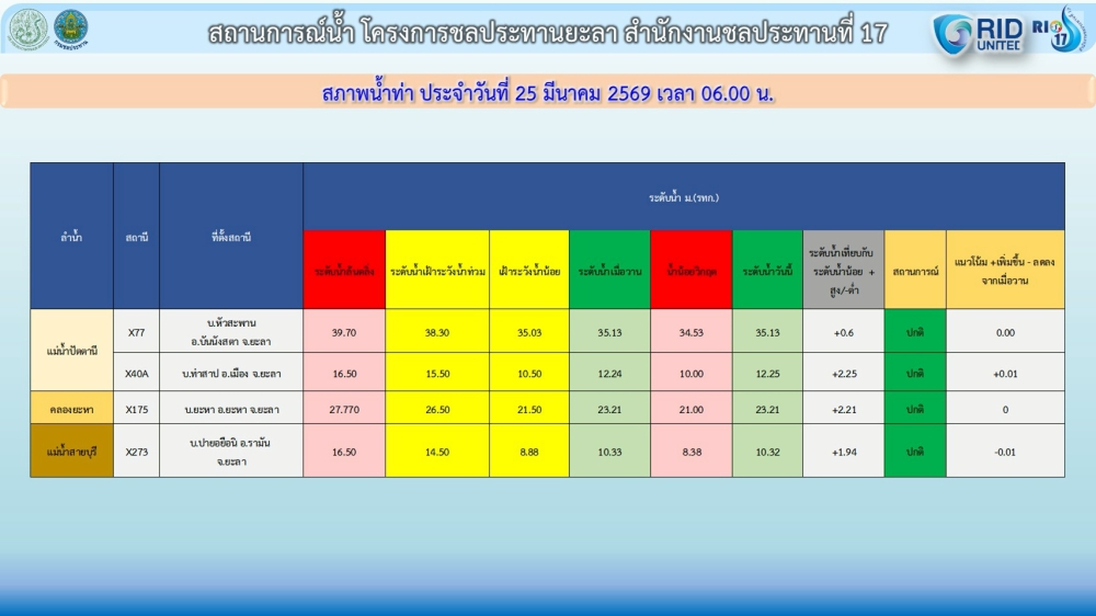 รายงานสถานการณ์น้ำจังหวัดยะลา ประจำวันที่ 25 มีนาคม 2569 เวลา 06.00 น. ศูนย์ปฏิบัติการน้ำอัจฉริยะ โครงการชลประทานยะลา