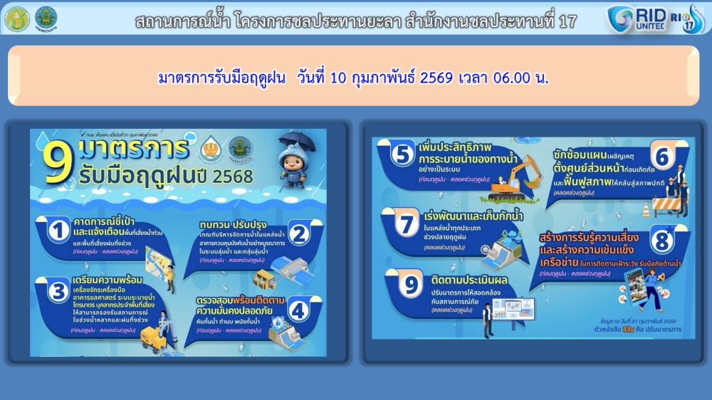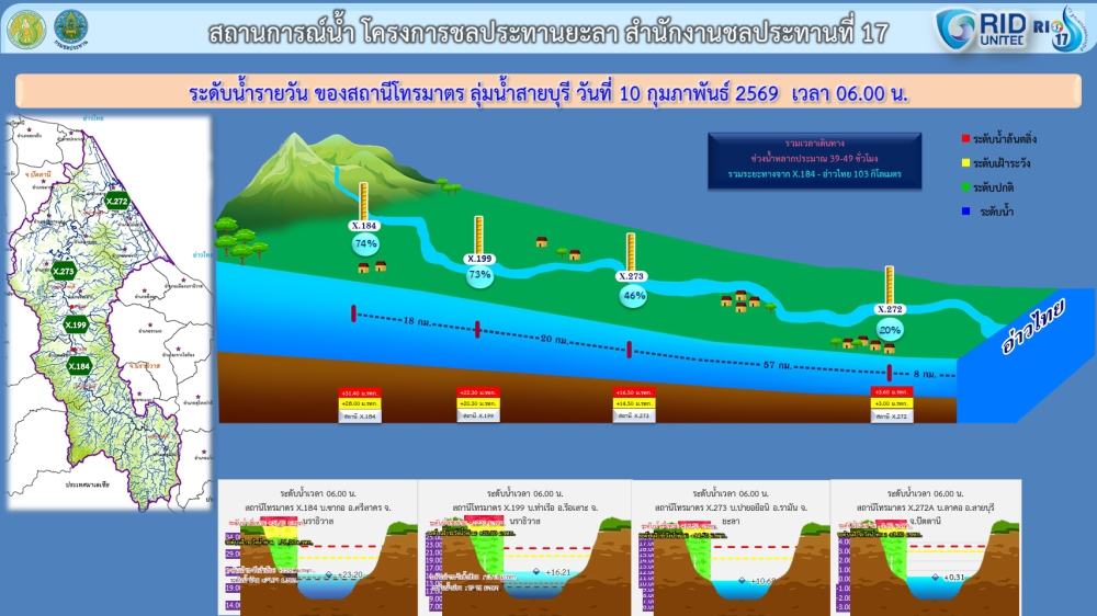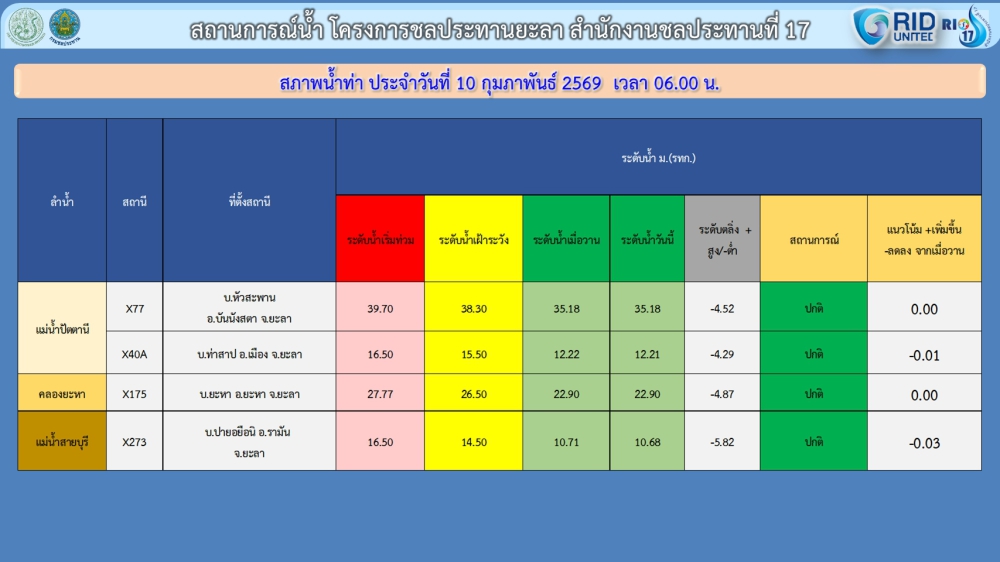 รายงานสถานการณ์น้ำจังหวัดยะลา ประจำวันที่ 10 กุมภาพันธ์ 2569 เวลา 06.00 น. ศูนย์ปฏิบัติการน้ำอัจฉริยะ โครงการชลประทานยะลา