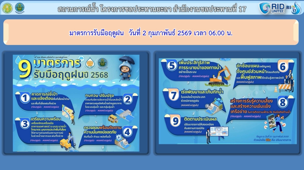 รายงานสถานการณ์น้ำจังหวัดยะลา ประจำวันที่ 2 กุมภาพันธ์ 2569 เวลา 06.00 น. ศูนย์ปฏิบัติการน้ำอัจฉริยะ โครงการชลประทานยะลา