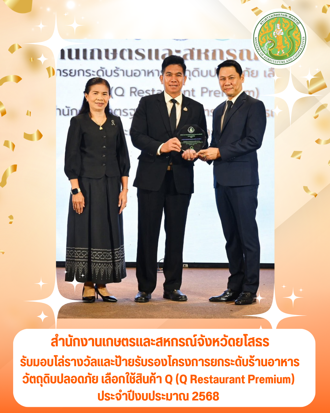 เกษตรและสหกรณ์จังหวัดยโสธร เข้ารับมอบโล่รางวัลจังหวัดดีเด่น และนำร้านอาหารบ้านคุณย่า สาขาริมทวน รับป้ายรับรอง "Q Restaurant Premium" ระดับประเทศ