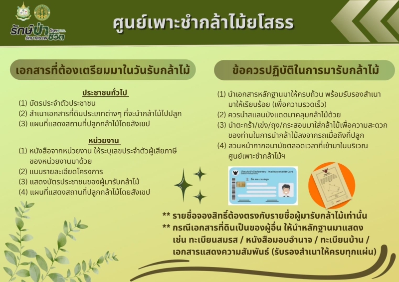 ขอเชิญผู้สนใจลงทะเบียนจองคิวรับต้นกล้าไม้ จากศูนย์เพาะชำกล้าไม้ยโสธร ตาม 3 ช่องทางข้างล่างนี้ได้เลย