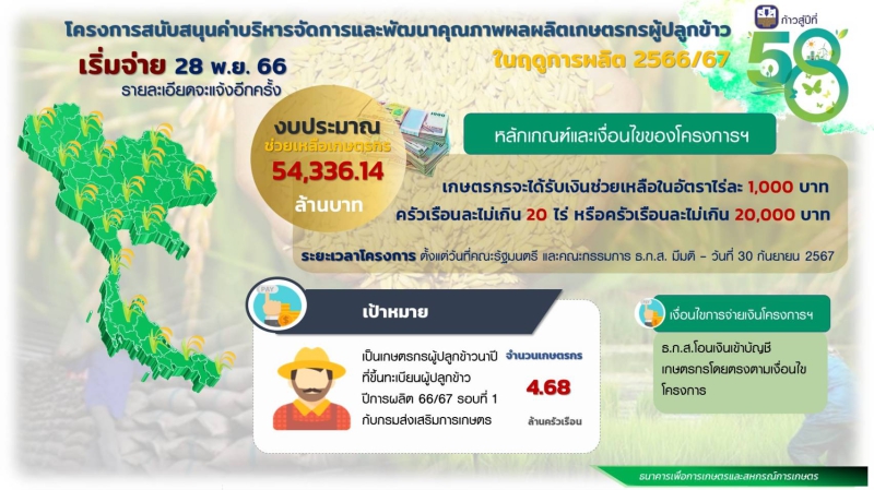 ธ.ก.ส. เริ่มจ่ายเงินโครงการช่วยเหลือชาวนาไร่ละ 1,000 บาท สูงสุดไม่เกิน 20 ไร่/ครัวเรือน (โครงการสนับสนุนค่าบริหารจัดการและพัฒนาคุณภาพผลผลิตเกษตรกรผู้ปลูกข้าว ปีการผลิต 2566/67) เริ่มตั้งแต่ 28 พฤศจิกายน 2566 เป็นต้นไป