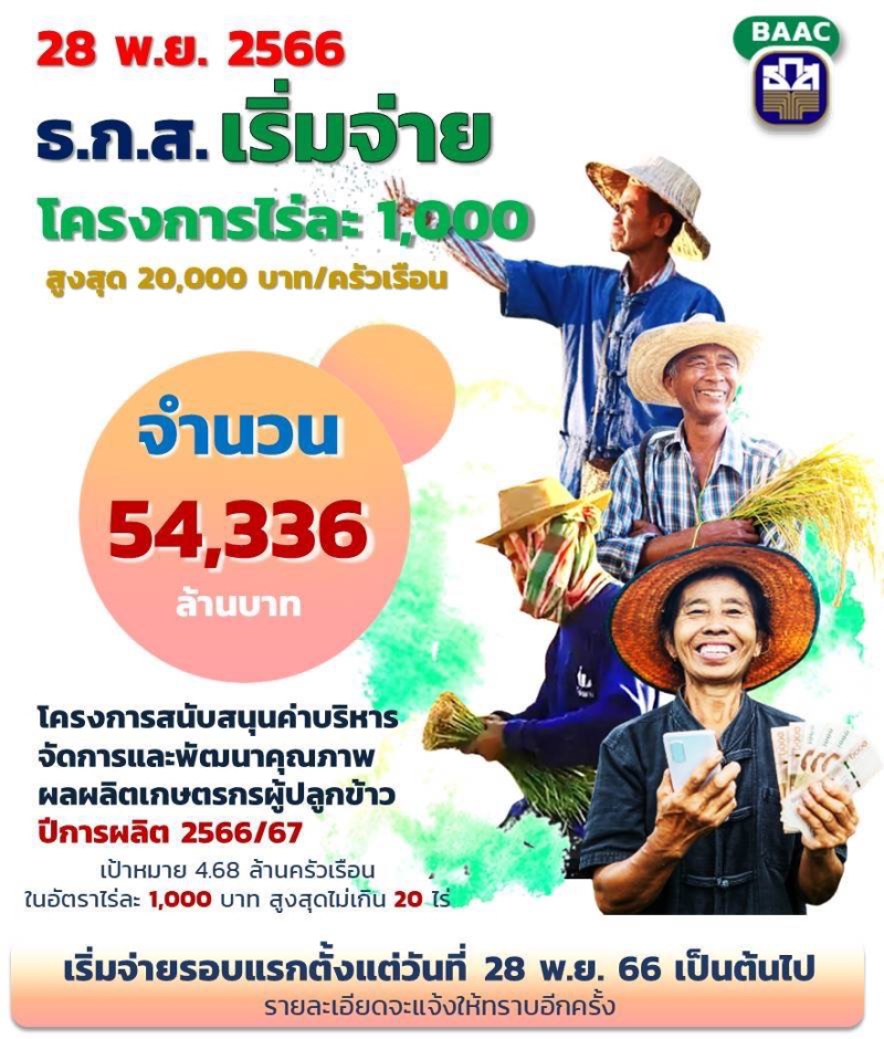 ธ.ก.ส. เริ่มจ่ายเงินโครงการช่วยเหลือชาวนาไร่ละ 1,000 บาท ตั้งแต่ 28 พฤศจิกายน 2566